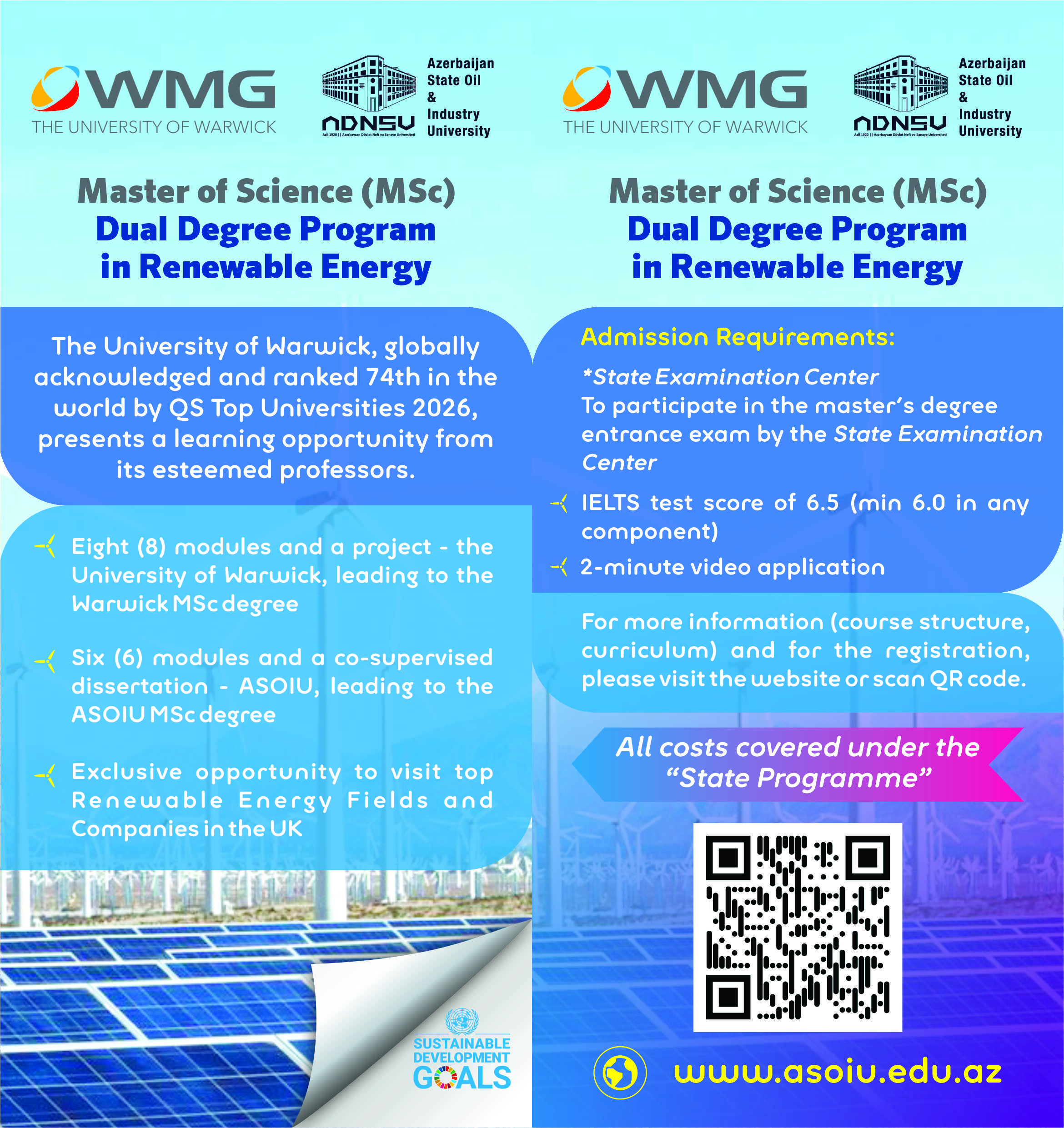 Embark on a transformative journey with the distinguished Master of Science (MSc) Dual Degree in Renewable Energy. This programme is a prestigious collaboration between the Azerbaijan State Oil and Industry University (ASOIU) and WMG at the University of Warwick, a globally recognized institution ranked 74th in the world by QS Top Universities 2026.