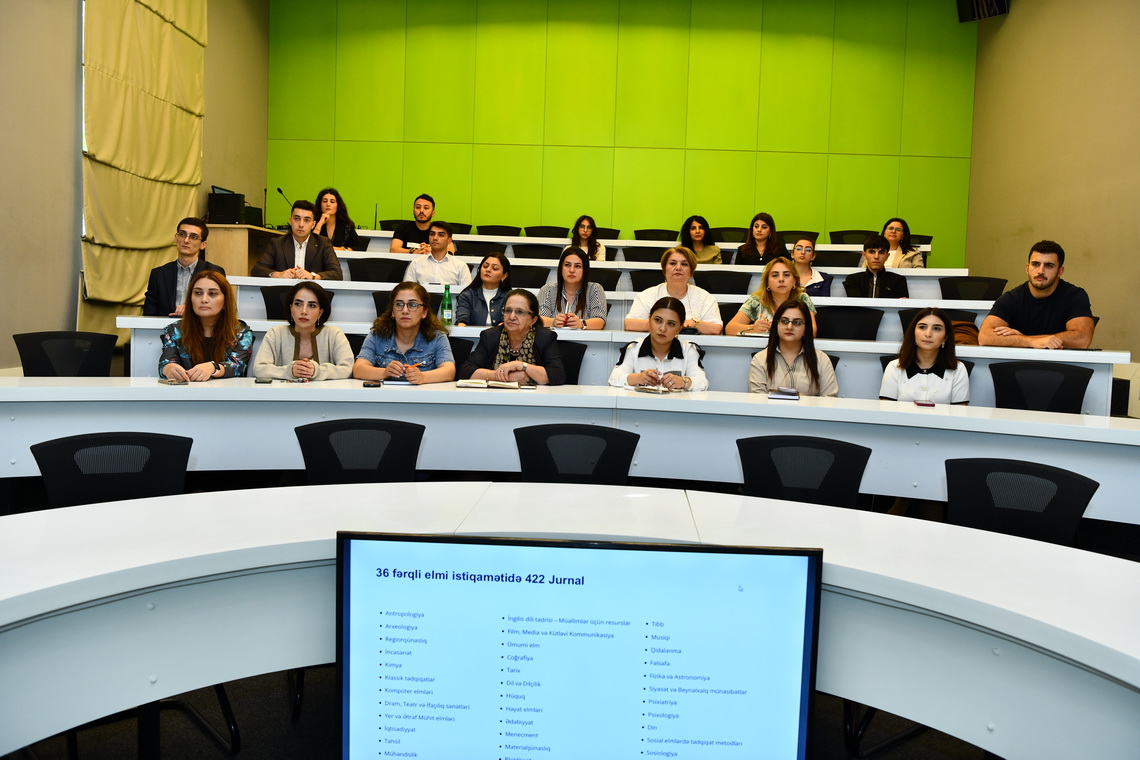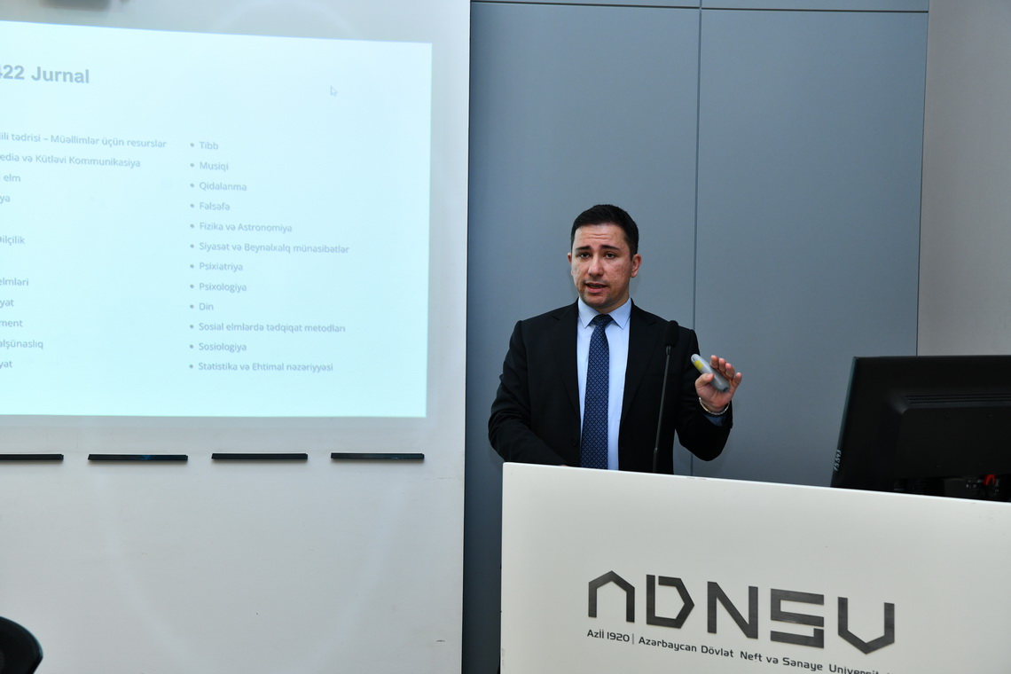 Tədbirdə ADNSU-nun Elmi Tədqiqatların Əlaqələndirilməsi və Monitorinqi Şöbəsinin müdiri Əli Əlizadə çıxış edərək “Cambridge Press” nəşriyyatına daxil olan və ödənişsiz məqalə qəbul edən jurnallar haqqında ətraflı məlumat verib. O, jurnalların siyahısını təqdim edib, həmin nəşrlərdə məqalə dərc etdirmək üçün tələb olunan mərhələlər, texniki tələblər və təqdimetmə qaydalarını izah edib.