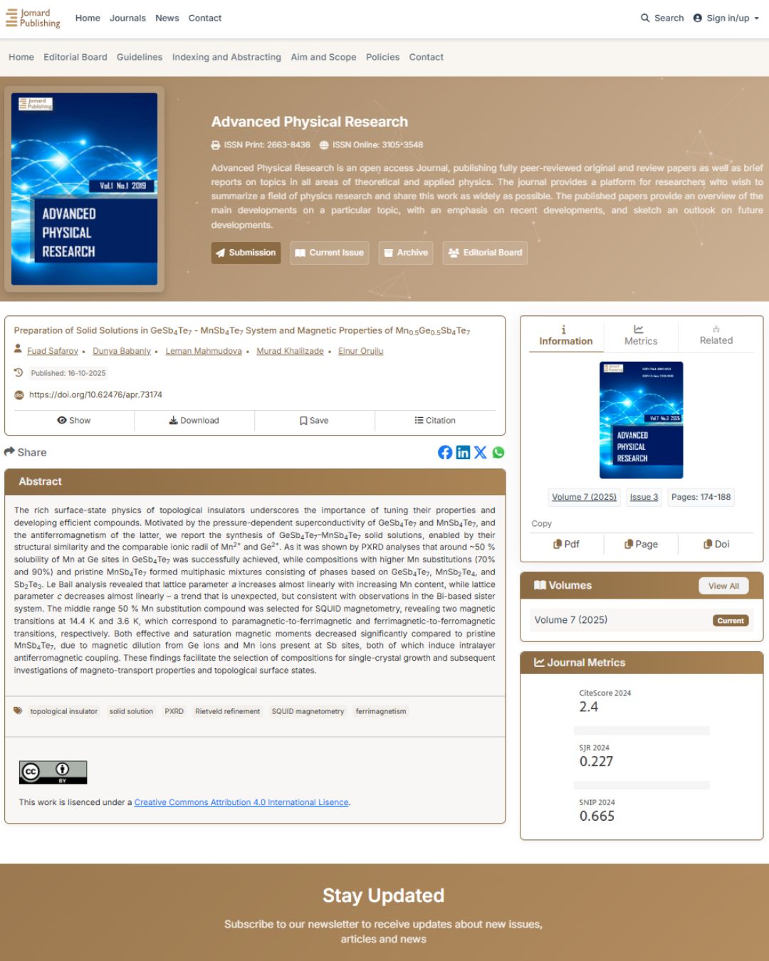 Tədqiqat qrupu GeSb₄Te₇–MnSb₄Te₇ sistemi üzərində işləyərək Mn₀.₅Ge₀.₅Sb₄Te₇ birləşməsinin maqnit xüsusiyyətlərini tədqiq edib. Tədqiqatın əsas hərəkətverici qüvvəsi elmə məlum olan GeSb₄Te₇ və MnSb₄Te₇ birləşmələrinin maraqlı superkeçiricilik xüsusiyyətləri, eləcə də MnSb₄Te₇-nin antiferromaqnit xarakteri olmuşdur. Tədqiqatın ilkin mərhələsində 50 mol% MnSb₄Te₇ tərkibli nümunə SQUID maqnitometriyası üçün seçilib və bu ölçmələr nəticəsində 14.4 K və 3.6 K temperaturda müvafiq olaraq paramaqnitdən ferrimaqnitə və ferrimaqnitdən ferromaqnitə iki maqnit keçid müşahidə edilib.