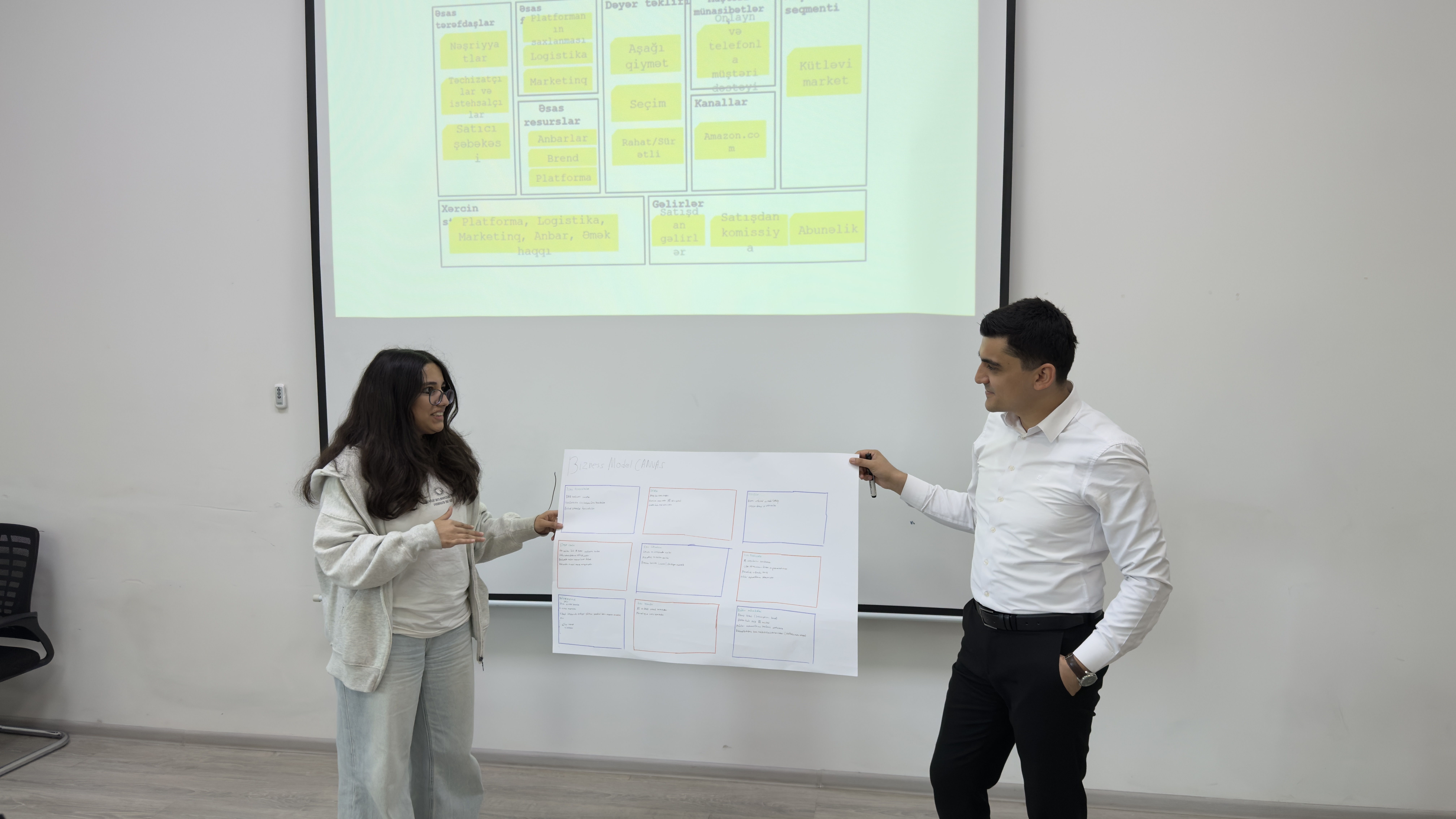 Təlim zamanı iştirakçılara biznes model kanvası, dəyər təklifi (Value Proposition), müştəri seqmentləri, gəlir modelləri və Customer Development yanaşması haqqında ətraflı məlumat verilib. Komandalar öz ideyalarına uyğun biznes modelini hazırlamağı öyrənib və praktiki tapşırıqlar vasitəsilə bu bilikləri tətbiq ediblər.