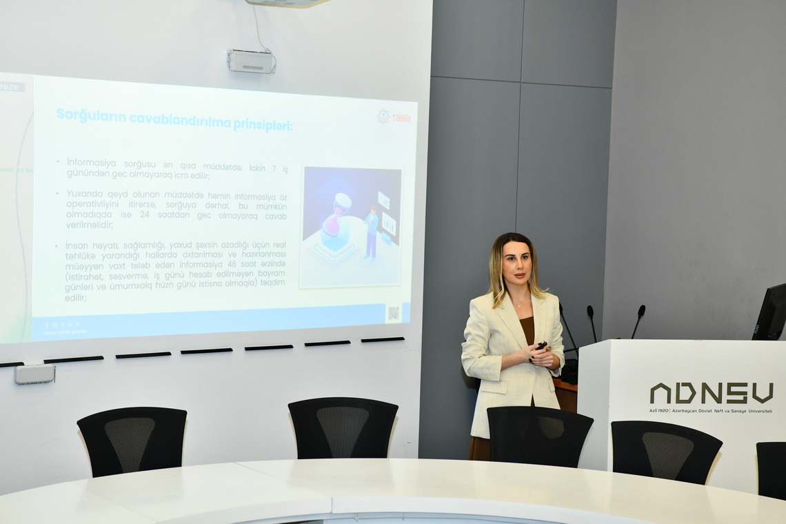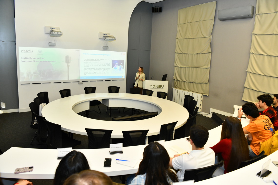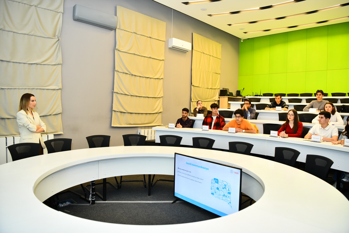 Azərbaycan Dövlət Neft və Sənaye Universitetində (ADNSU) həyata keçirilən “Natiqlik sənəti və kommunikasiya bacarıqları” layihəsinin növbəti təlimi baş tutub. Bu dəfə layihənin qonaq təlimçisi TƏBİB-in İctimaiyyətlə əlaqələr və kommunikasiya departamentinin rəhbəri Zamirə Ədilova olub. Təlim “Etik və şəffaf kommunikasiya: etibarı qurmaq, fakt və emosiyanın balansı” mövzusuna həsr olunub. Zamirə Ədilova çıxışında dövlət qurumlarında kommunikasiya prosesinin əsas prinsipləri, məlumatın doğru və operativ təqdim edilməsi, ictimai etibarın formalaşması və kommunikasiya şəffaflığının əhəmiyyəti barədə danışıb.