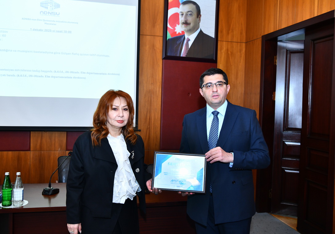 İclasın əvvəlində rektor, dosent Rüfət Əzizov ADNSU himninin sözlərini yazdığı və musiqisini bəstələdiyi üçün Gülşən Rafiq qızı Əliyevanı təbrik edib, onun bu vətənpərvər yaradıcılığını yüksək qiymətləndirərək sertifikatla təltif edib.