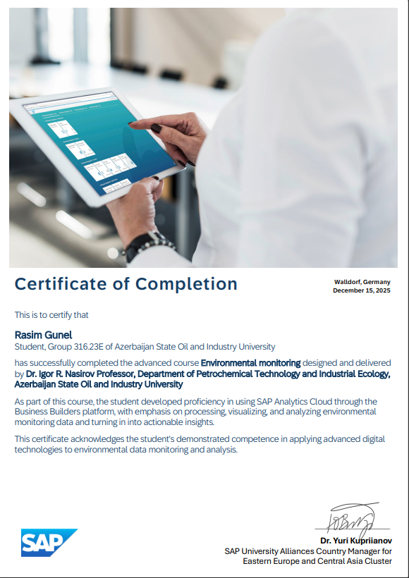 Qeyd edək ki, bir semestr davam edən təlim proqramı ADNSU-nun Neft-kimya texnologiyası və sənaye ekologiyası kafedrasının nəzdində, Ekologiya mühəndisliyi ixtisası üzrə təhsil alan tələbələr üçün təşkil edilib. Kurs ADNSU-nun müəllimi İqor Nəsirov tərəfindən “SAP Analytics Cloud və SAP Business Builders” platformalarının inteqrasiyası əsasında təşkil olunub.
