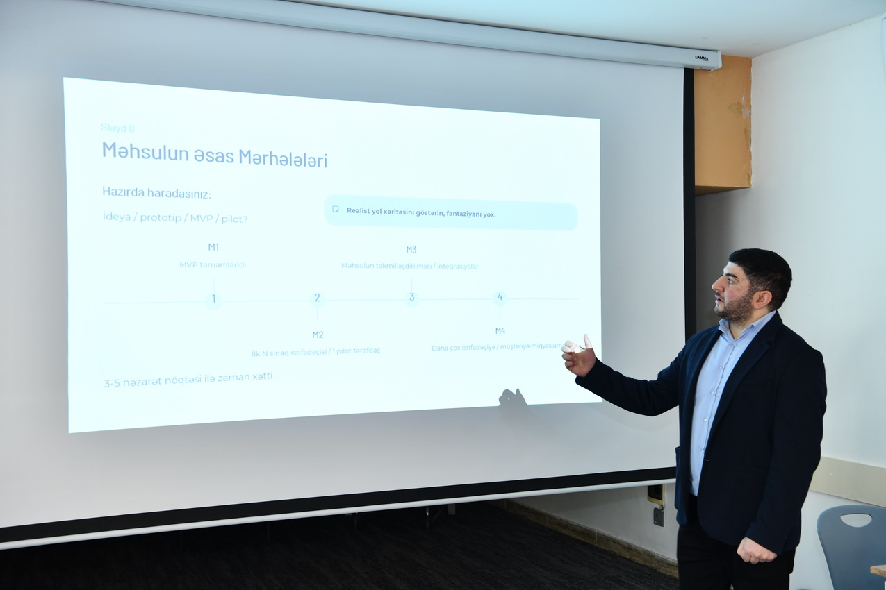 Əhməd Əhmədzadə çıxışında pitching prosesinin ən vacib elementlərini – problemin düzgün formalaşdırılması, həll təklifinin aydın izahı, biznes modelin davamlılığı, rəqib analizinin aparılması və bazar analizinin dəqiq qiymətləndirilməsi kimi komponentləri detallı şəkildə izah edib. O, həmçinin bazara çıxış strategiyasının hazırlanması, komandanın rolu və investorların ən çox diqqət etdiyi məqamlar barədə praktiki nümunələr təqdim edib.