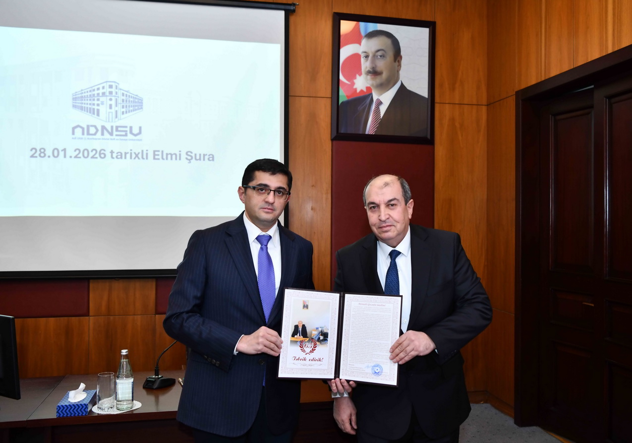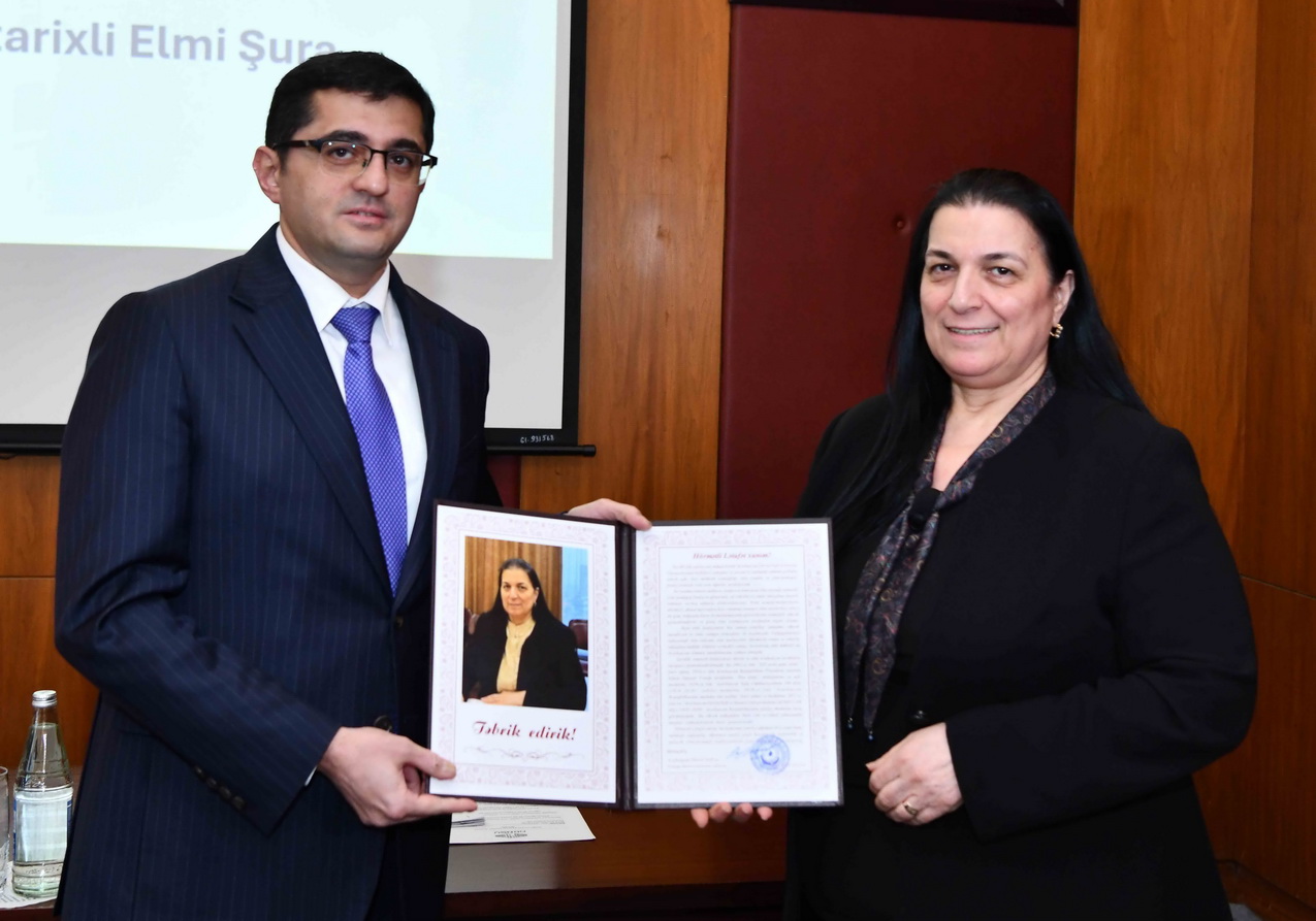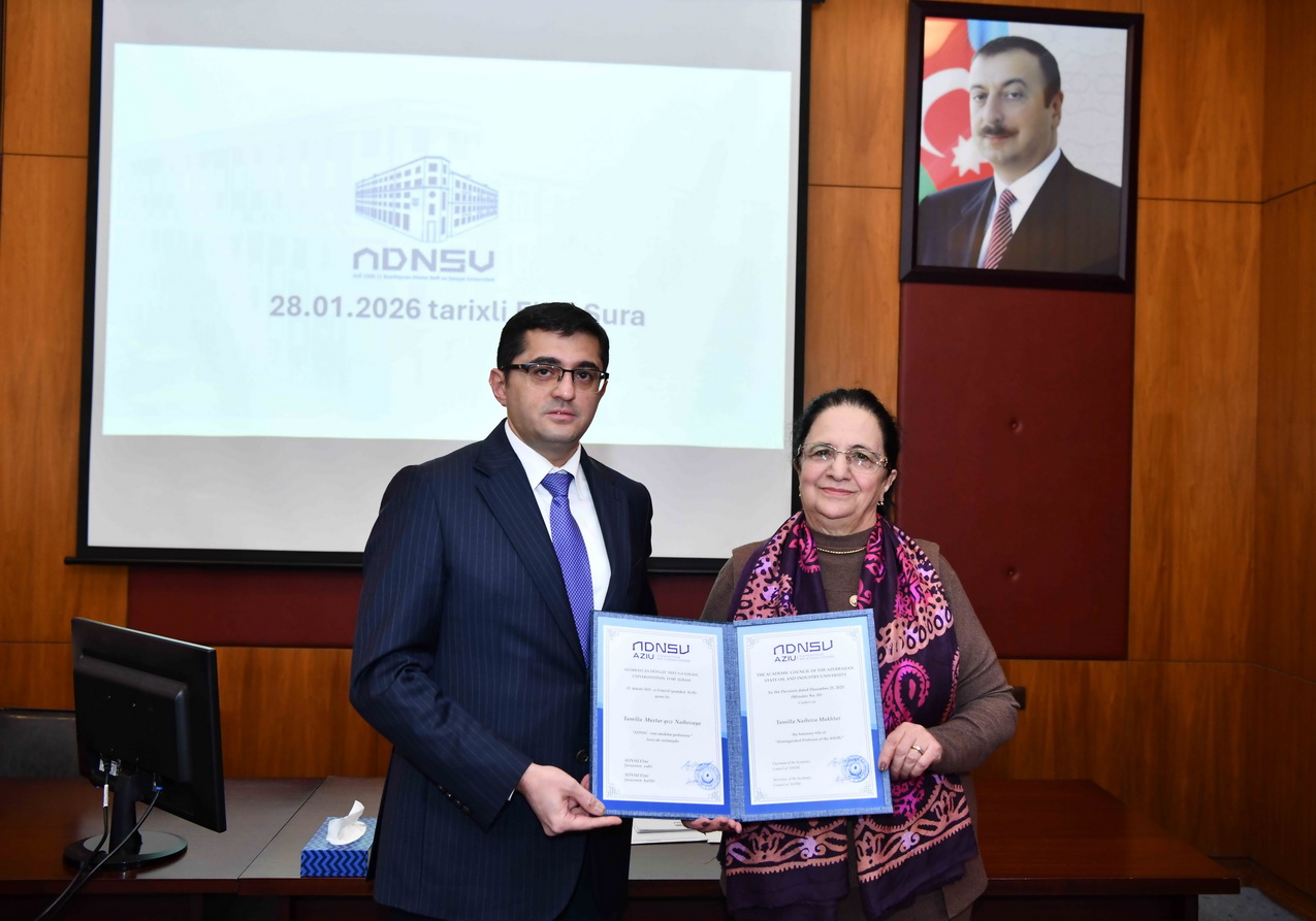 İclasdan öncə ADNSU-nun rektoru, dosent Rüfət Əzizov Elmi Şuranın üzvləri - professor Lətafət Qardaşova, professor Sakit Rəsulov və professor Qəzənfər Süleymanovu yubiley yaşları münasibətilə təbrik edib, onlara möhkəm cansağlığı və elmi-pedaqoji fəaliyyətlərində uğurlar arzulayıb. Daha sonra rektor dosent Tamilla Naibovaya ADNSU-nun “Əməkdar professoru” diplomunu təqdim edərək onu Elmi Şura üzvləri adından təbrik edib.