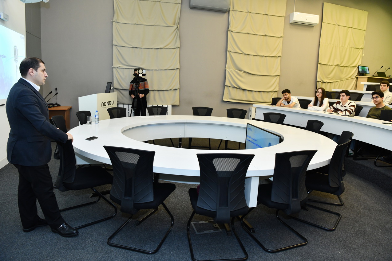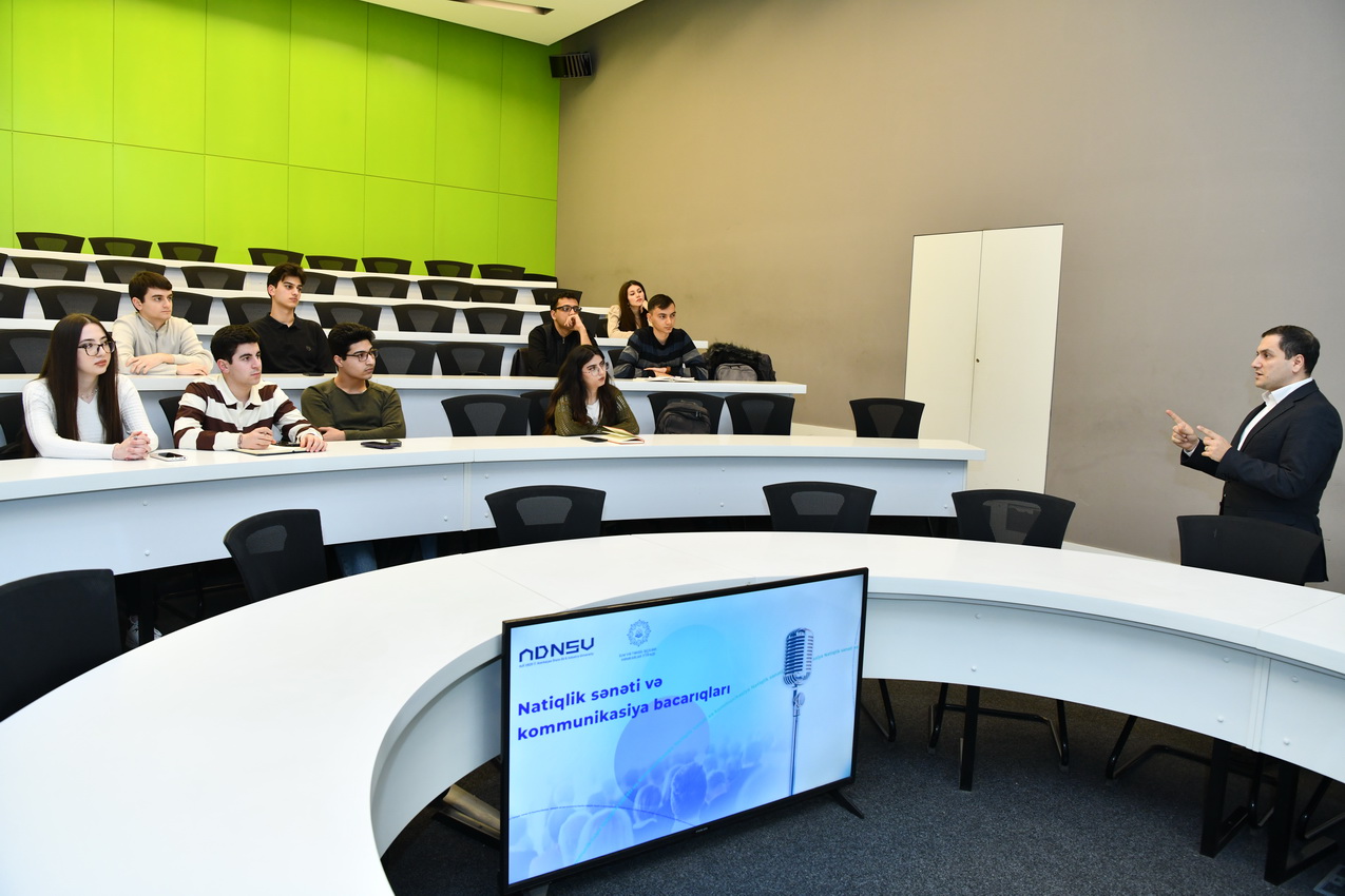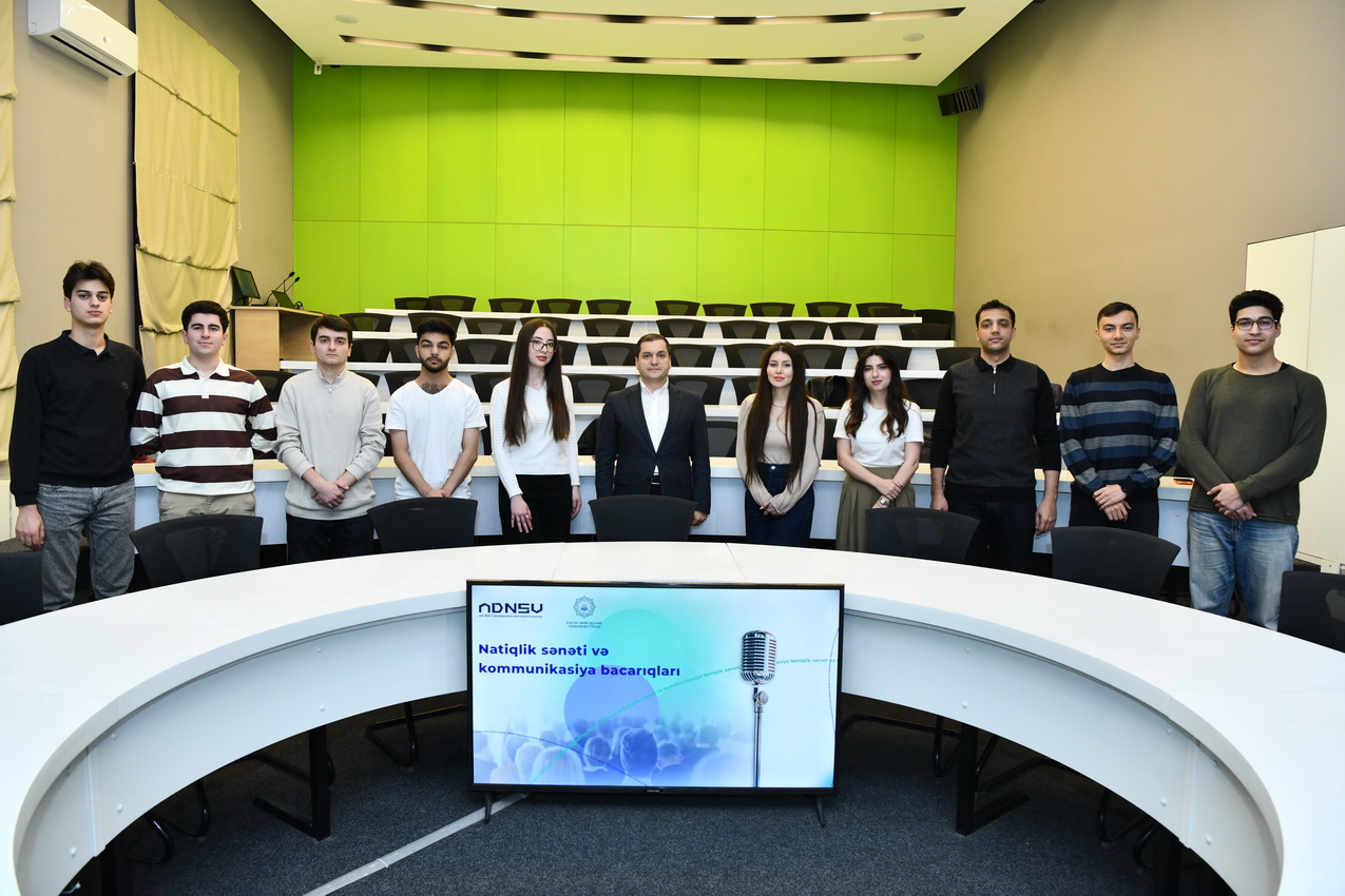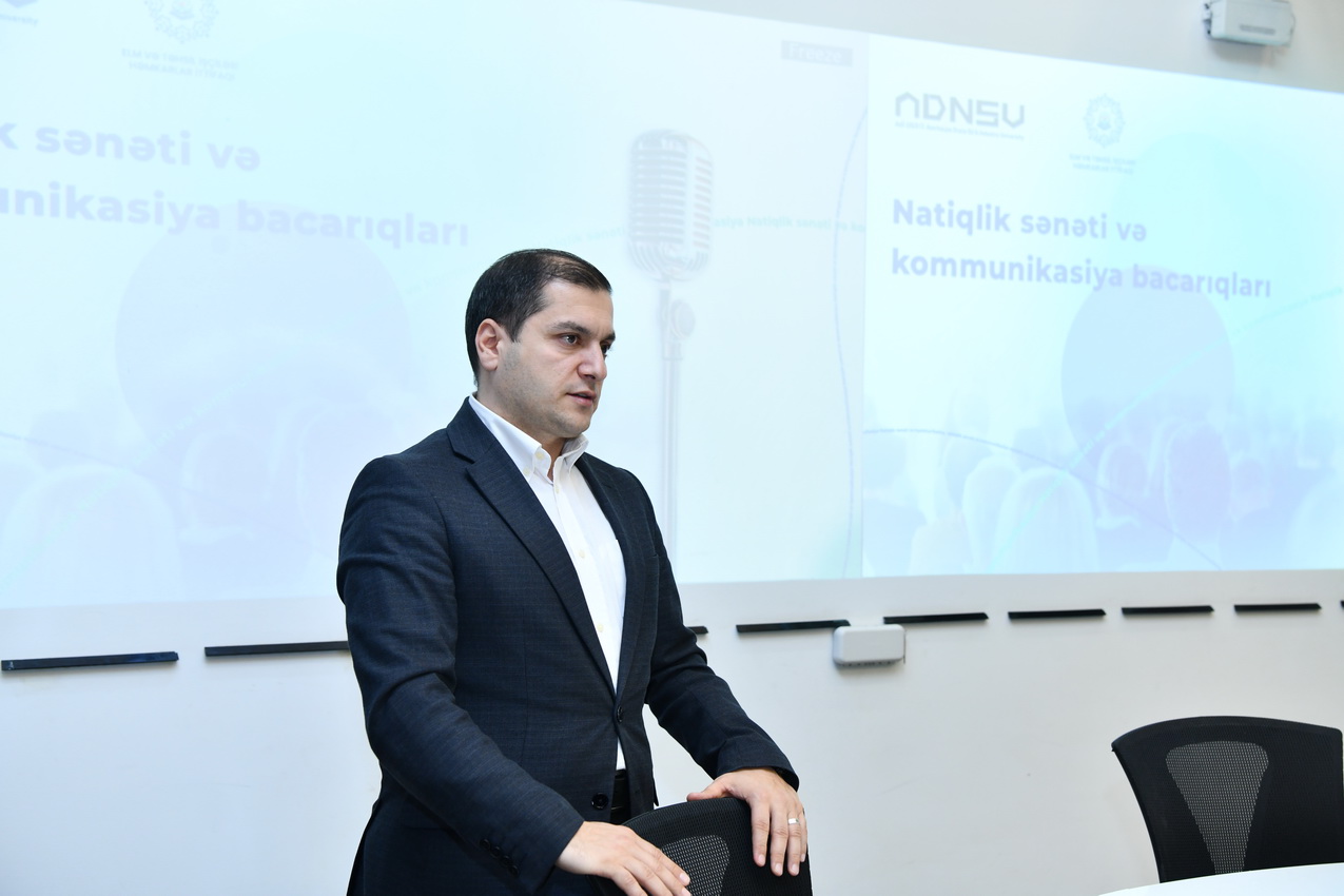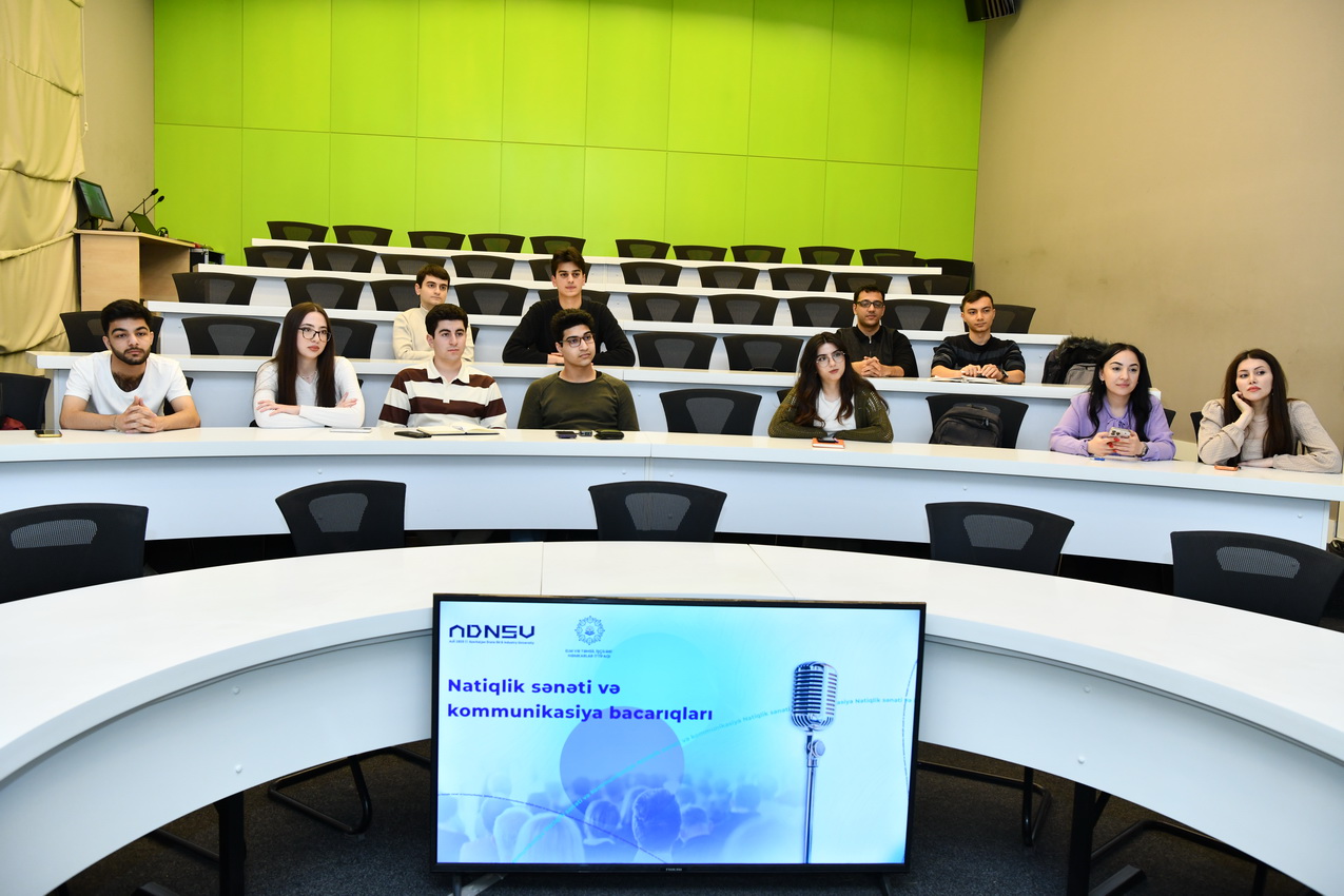 Azərbaycan Dövlət Neft və Sənaye Universitetində (ADNSU) “Natiqlik sənəti və kommunikasiya bacarıqları” layihəsi çərçivəsində növbəti təlim baş tutub. Bu dəfə layihənin qonaq təlimçisi Azərbaycan Respublikasının Prezidenti yanında Vətəndaşlara Xidmət və Sosial İnnovasiyalar üzrə Dövlət Agentliyinin İctimaiyyətlə əlaqələr şöbəsinin müdiri, filologiya üzrə fəlsəfə doktoru Elnur Niftəliyev olub.
