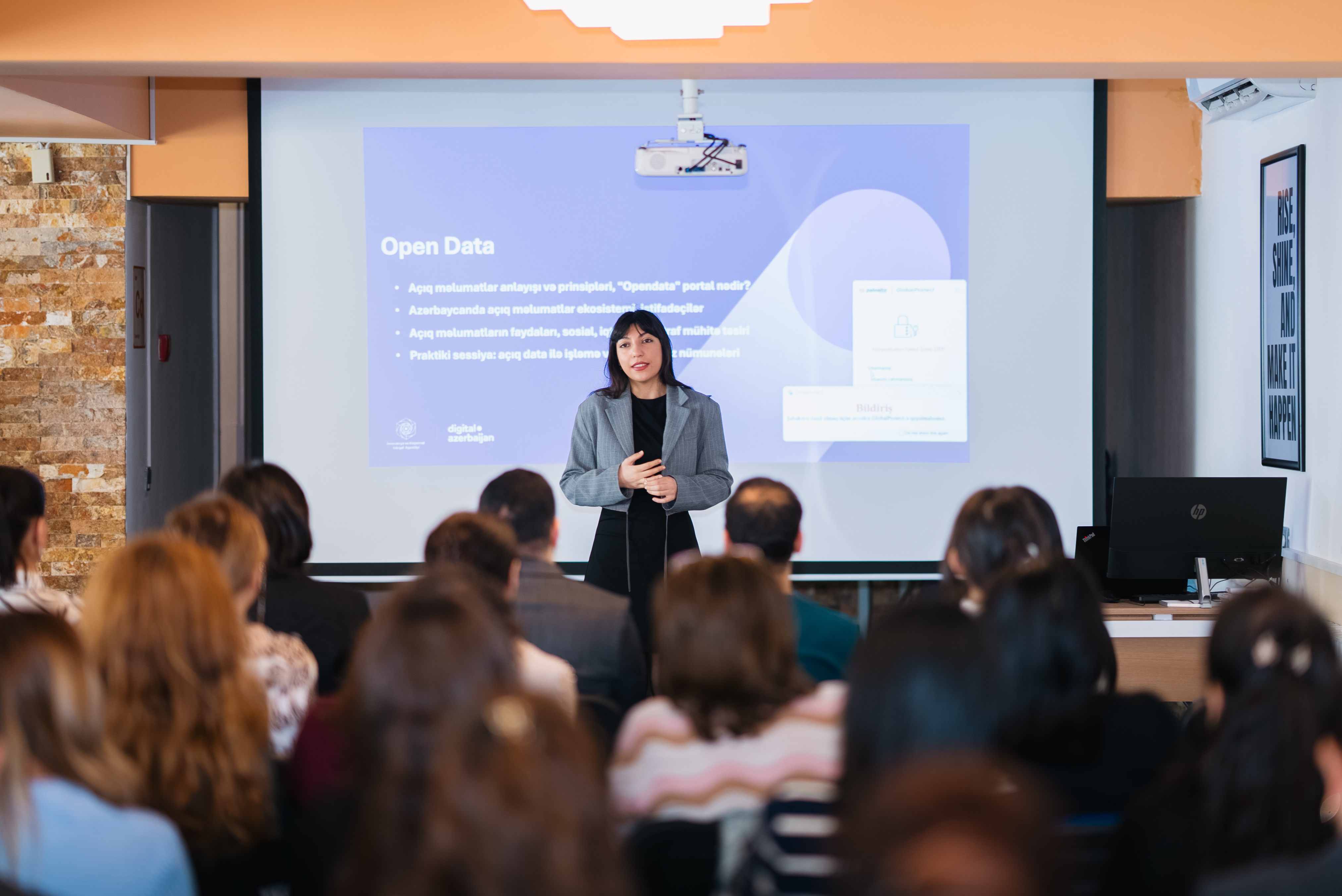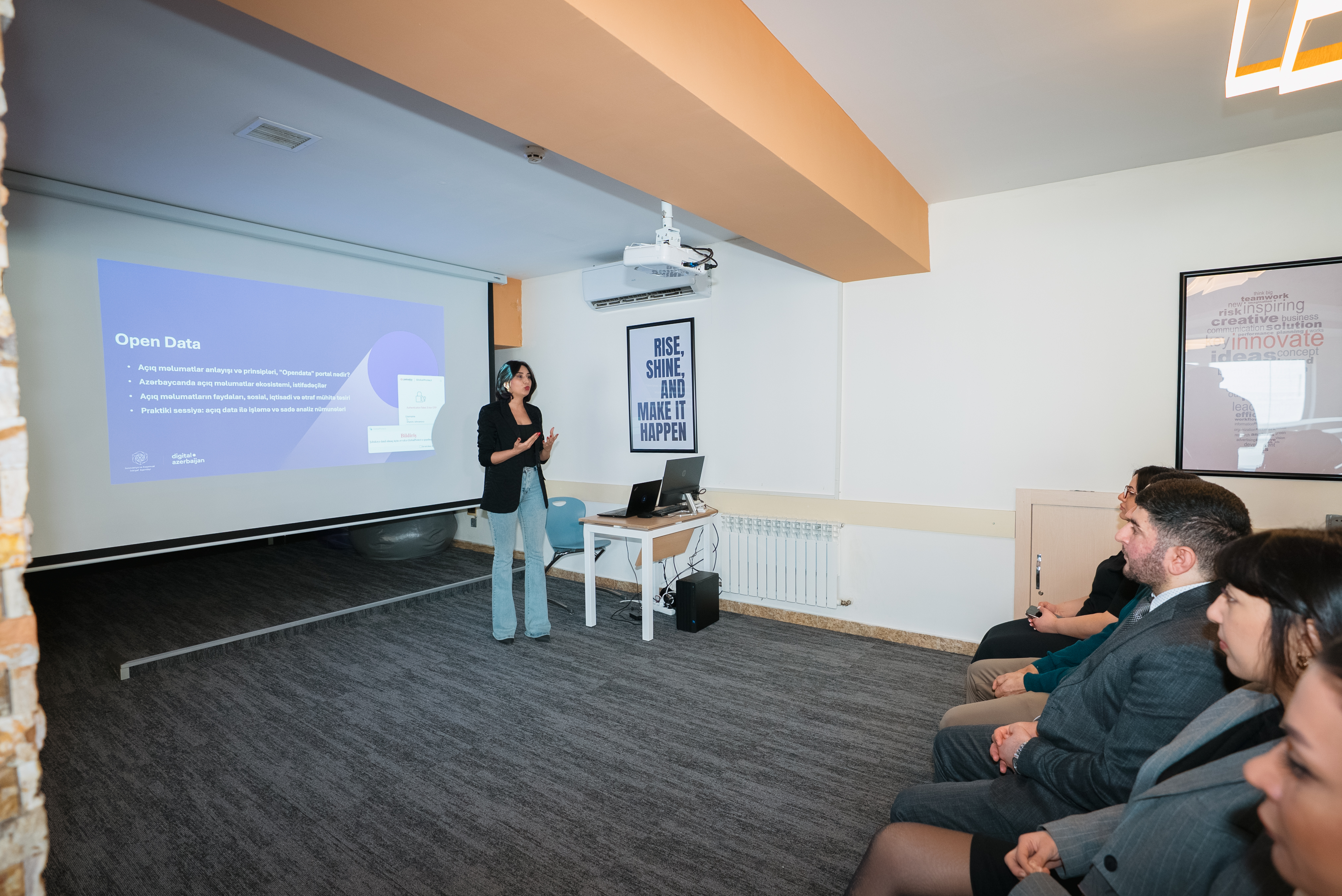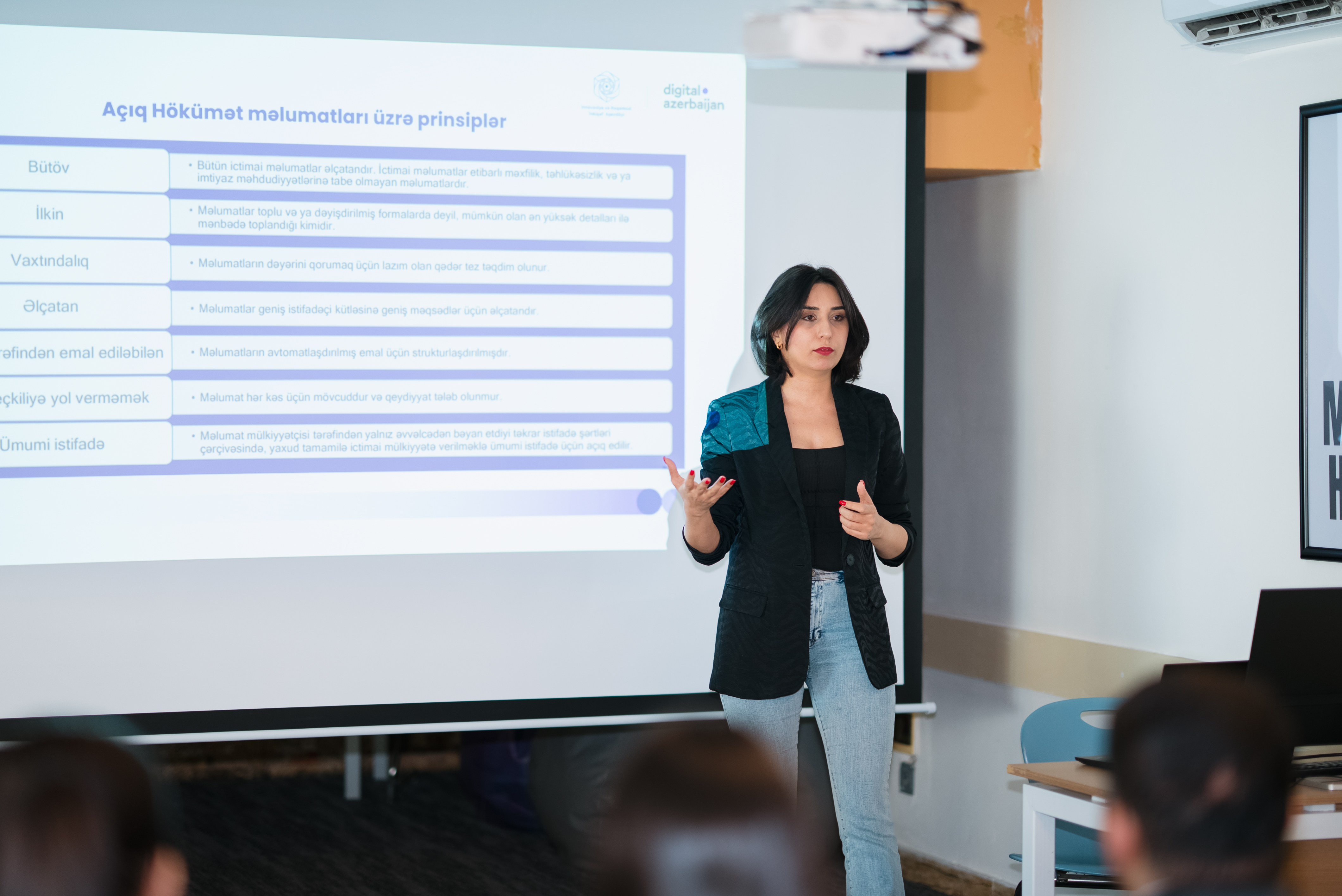 Təlimçi Xanım Rəhmanova təqdimatı zamanı açıq məlumat anlayışı, beynəlxalq təcrübə, Azərbaycanda açıq məlumatlar ekosistemi, hüquqi və institusional çərçivə, eləcə də açıq məlumatların innovasiya və data əsaslı qərarvermədə rolu barədə ətraflı məlumat verib. Eyni zamanda açıq məlumatların sosial və iqtisadi inkişafda əhəmiyyəti, dövlət və özəl sektorda tətbiqi imkanları iştirakçıların diqqətinə çatdırılıb.