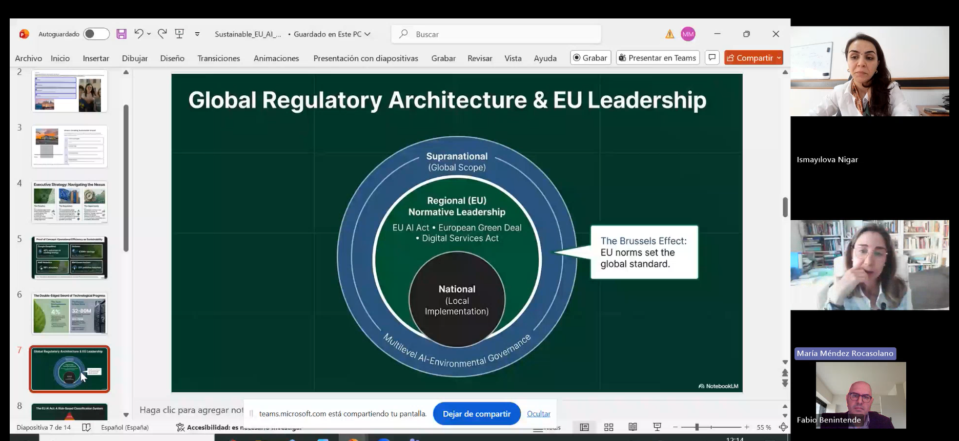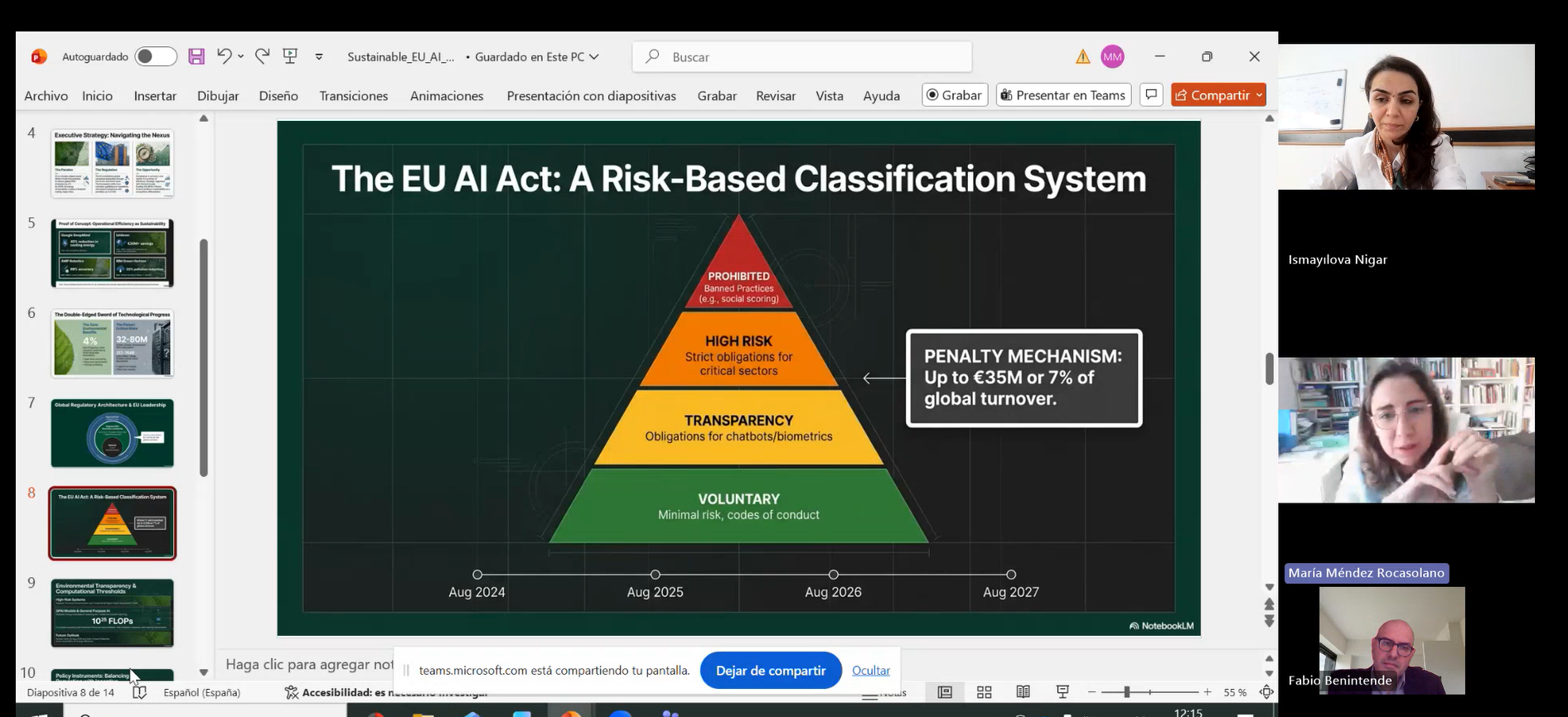 Tədbirdə məruzəçilər - Nigar İsmayılova “Süni intellekt, maşın və ekoloji modelləşdirmə” mövzusunda, María Méndez Rocasolano “Fundamental hüquqlar, ekoloji hüquq və texnoloji innovasiyaların idarəedilməsi”, Fabio Benintende isə “Avropa dayanıqlılıq tənzimləmələri və bioyanacaq siyasəti” mövzuları üzrə çıxış ediblər.