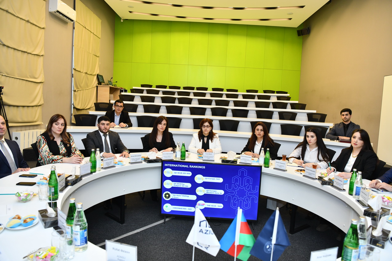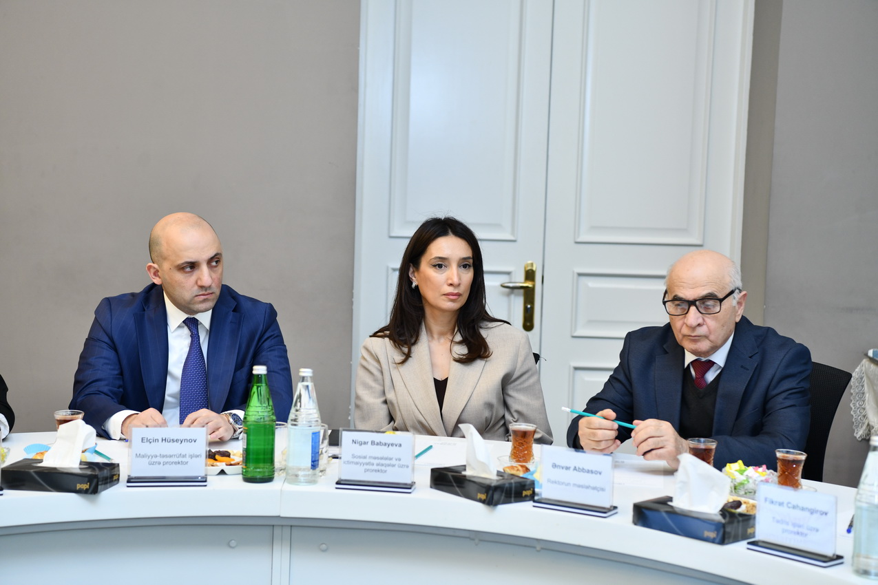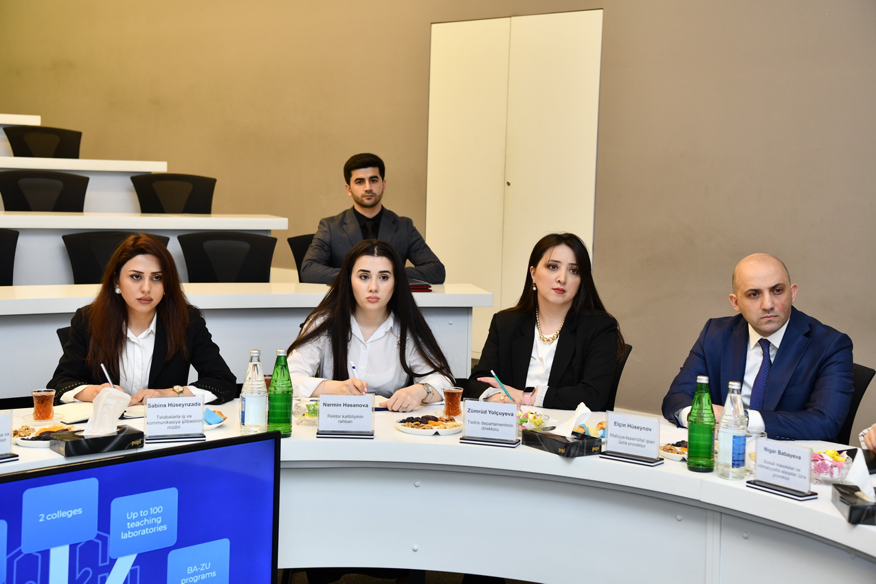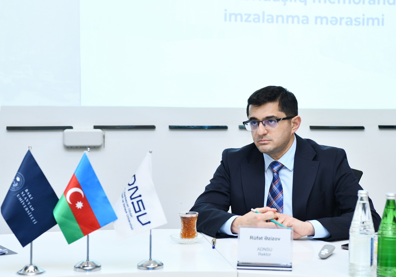 ADNSU və BSU-nun prorektorları, struktur bölmə rəhbərləri,bir sıra şöbə müdirlərinin iştirakı ilə keçirilən görüşdə qonaqları salamlayan ADNSU-nun rektoru Rüfət Əzizov universitetin tarixi, fəaliyyət istiqamətləri, tədris prosesinin mövcud vəziyyəti və təhsil ocağının beynəlxalq əlaqələrihaqda məlumat verib. O, universitetin əsas hədəfinin tədqiqat universitetinə çevrilmək olduğunu diqqətə çatdırıb.