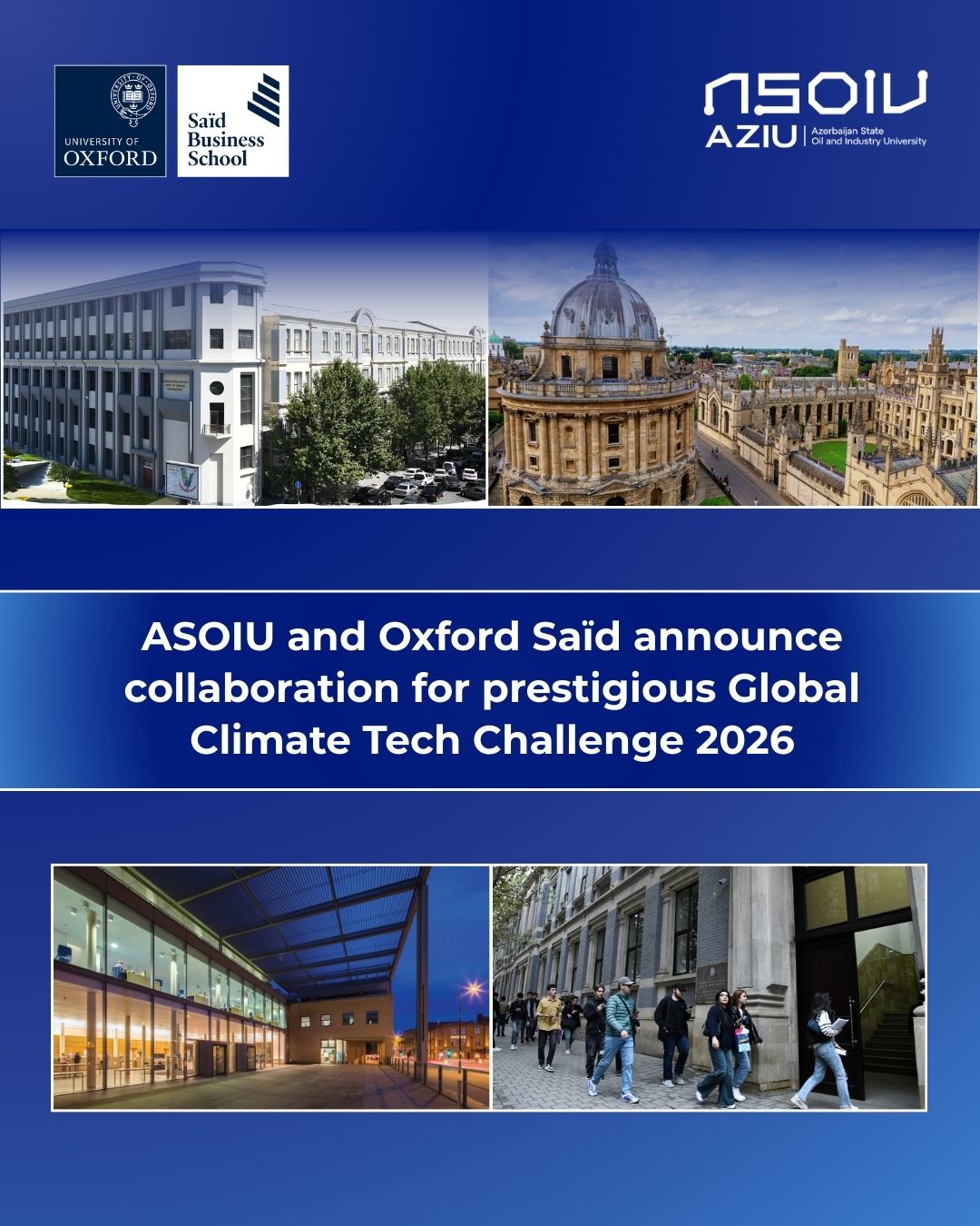 Azərbaycan Dövlət Neft və Sənaye Universiteti (ADNSU) iqlim dəyişikliyi ilə bağlı beynəlxalq təşəbbüslər çərçivəsində Oksford Universitetinin Said Biznes Məktəbi ilə əməkdaşlıq elan edir. Əməkdaşlıq “Oxford Said Qlobal İqlim Texnologiyaları Müsabiqəsi 2026” layihəsi çərçivəsində həyata keçirilir.