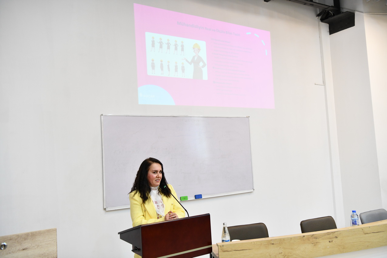 Sessiya SOCAR Upstream-in aparıcı proses mühəndisi Nuridə Məmmədova tərəfindən aparılıb. N.Məmmədova neft-qaz sektorunda 17 illik peşəkar təcrübəsini tələbələrlə bölüşərək mühəndislik sahəsində karyera qurmaq istəyən gənc xanımlara tövsiyələr verib.