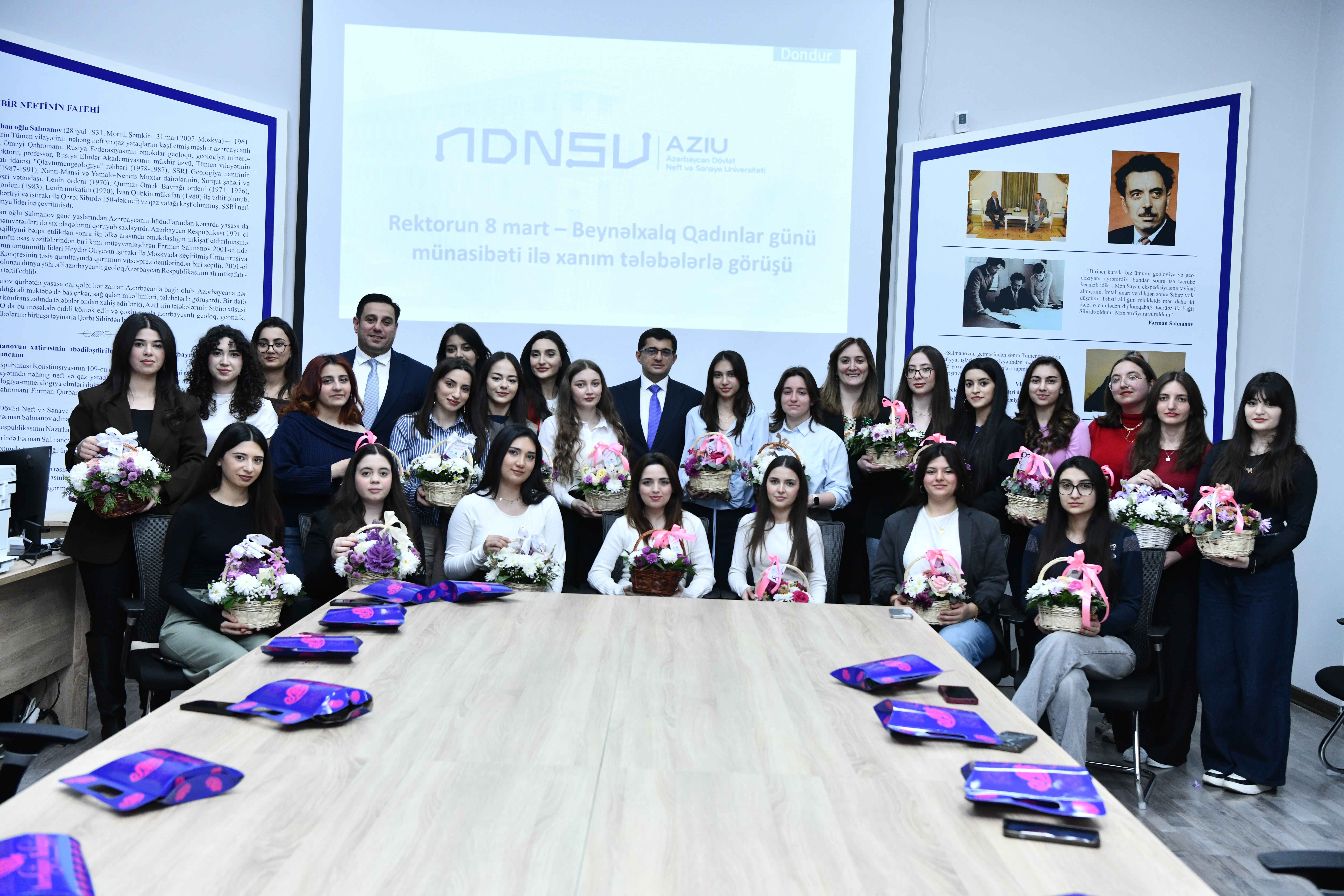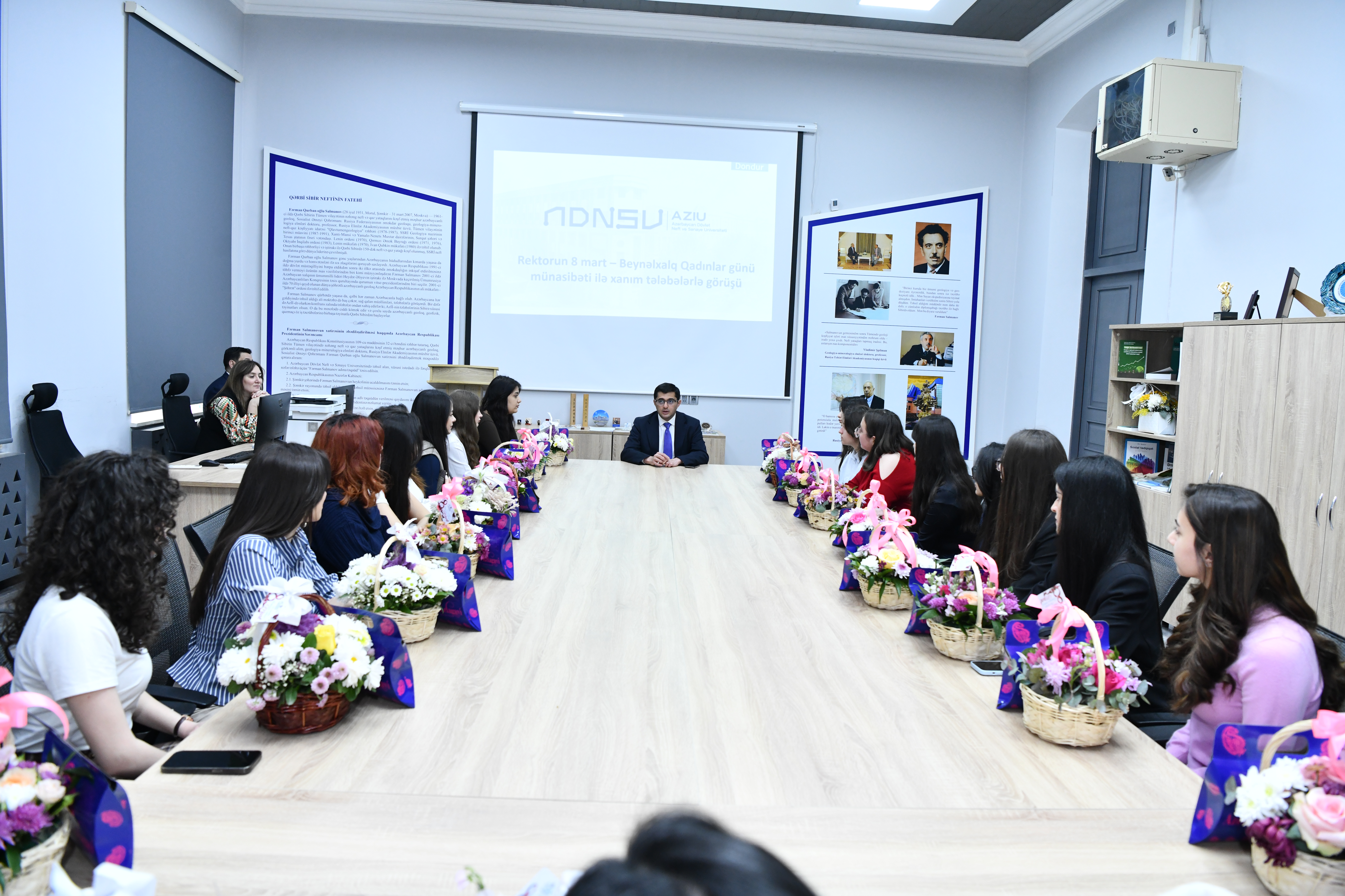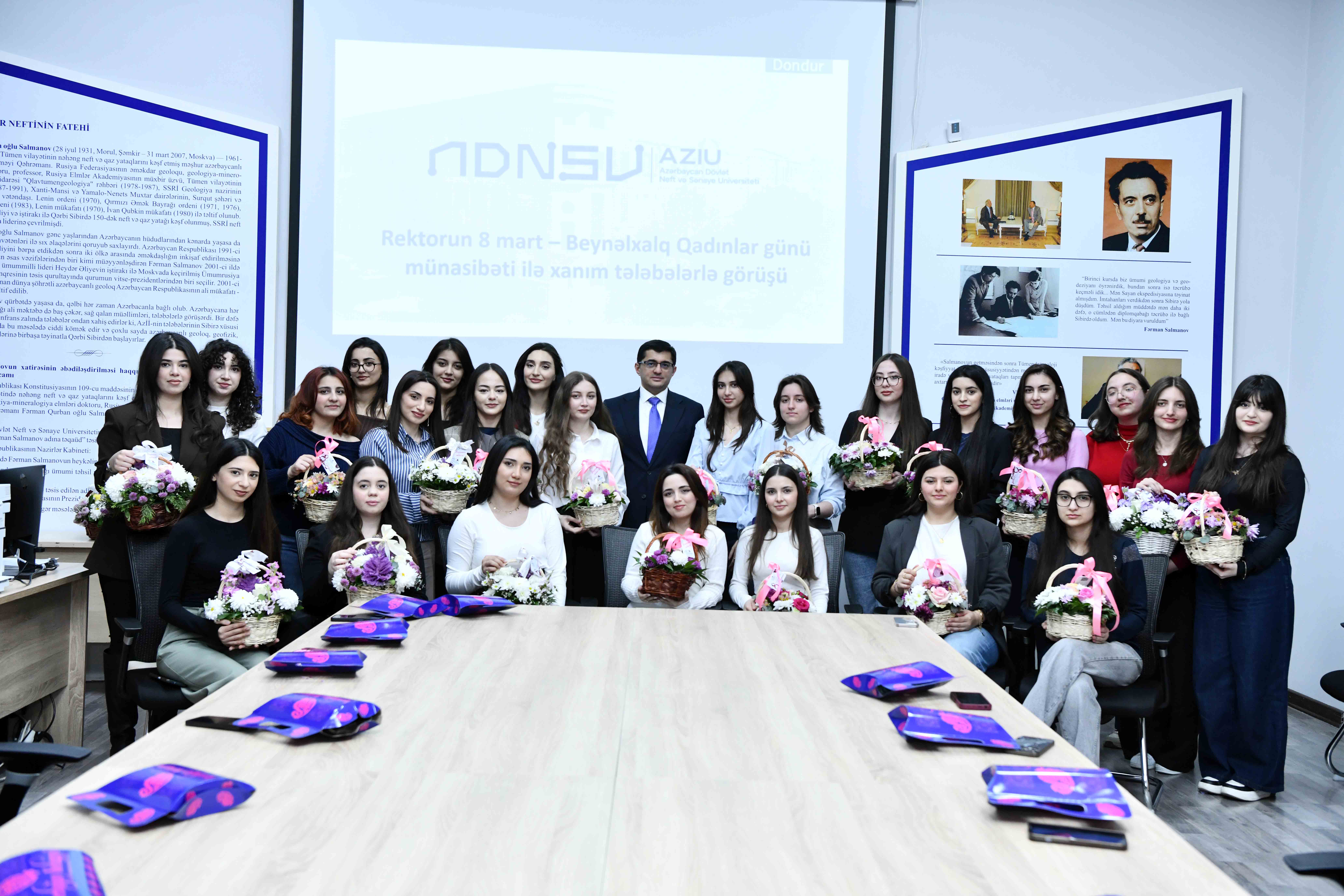 8 Mart - Beynəlxalq Qadınlar Günü münasibətilə Azərbaycan Dövlət Neft və Sənaye Universitetinin rektoru, dosent Rufat Əzizov universitetin xanım tələbələri ilə görüşü keçirilib. Görüşdə ali təhsil müəssisəsində ictimai fəallığı ilə seçilən tələbə qızlar iştirak ediblər.