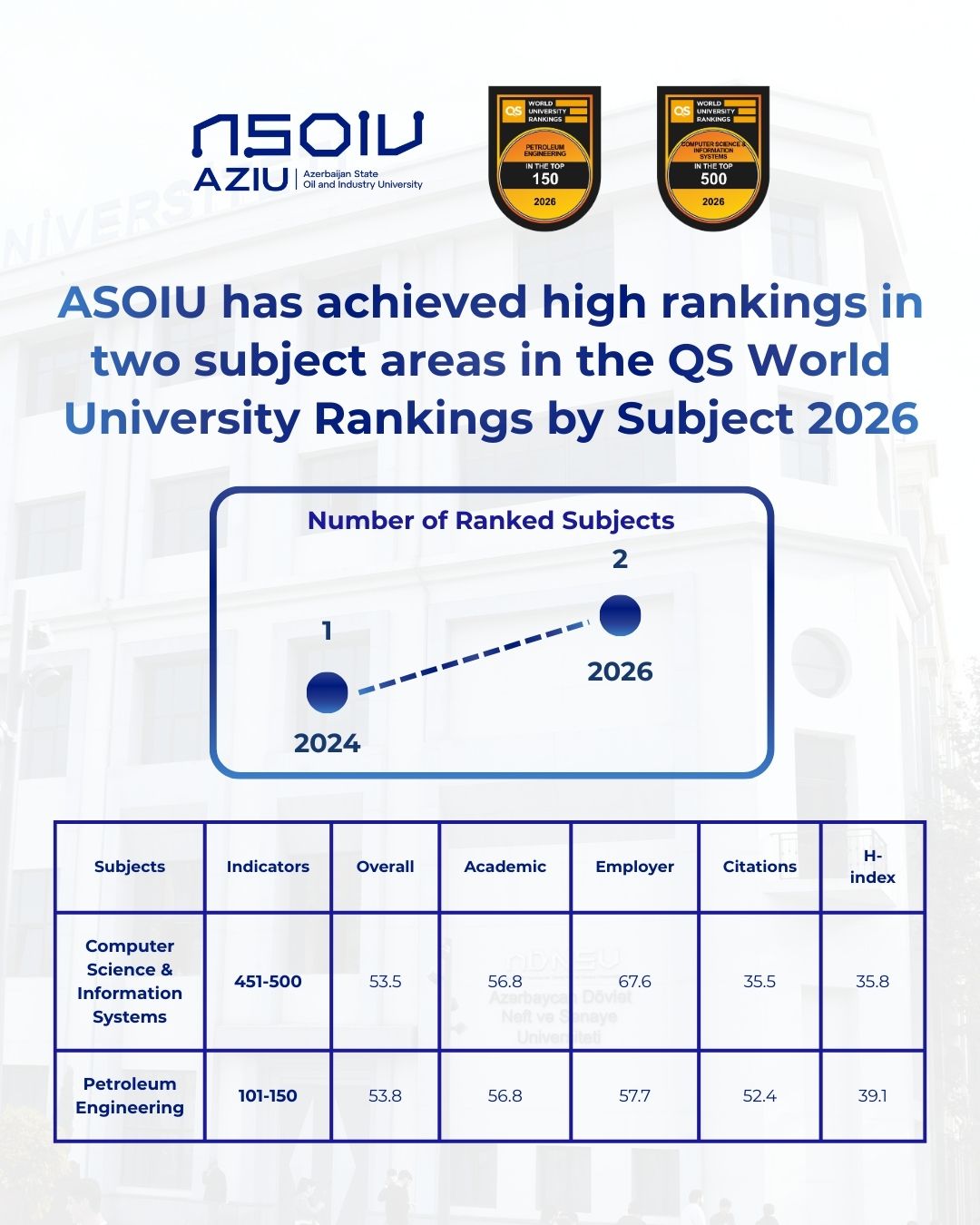 Reytinqin nəticələrinə əsasən ADNSU neft mühəndisliyiistiqaməti üzrə 101–150, Kompüter elmləri və informasiyasistemləri istiqaməti üzrə isə 451–500 intervalında qərarlaşıb.