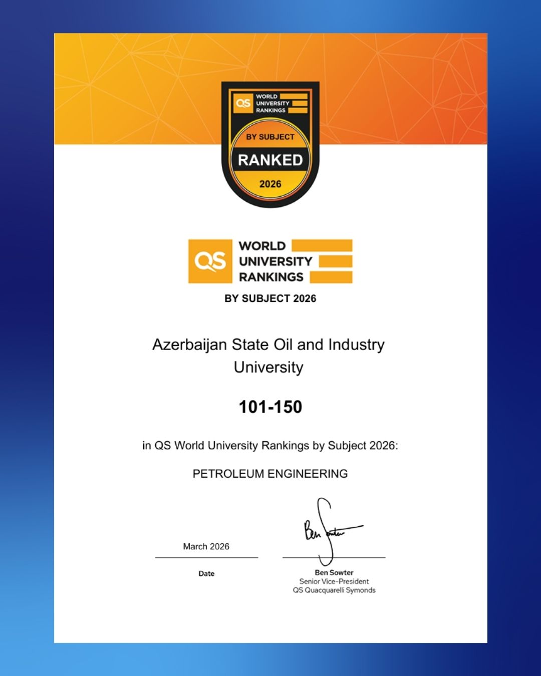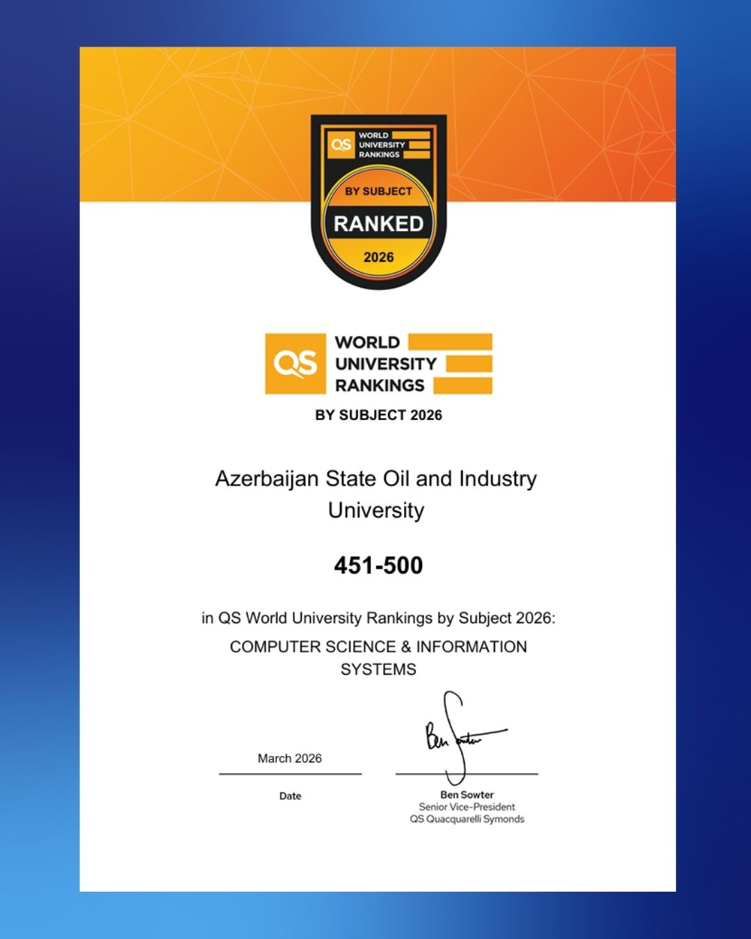 Azərbaycan Dövlət Neft və Sənaye Universiteti (ADNSU) QS reytinq agentliyinin fənn sahələri üzrə 2026-cı il nəticələrindəmühüm elmi nailiyyət əldə edib. Universitet kompüter elmlərivə informasiya sistemləri istiqaməti üzrə ilk dəfə qlobal reytinqsiyahısına daxil olub və 451–500 intervalında qərarlaşıb.Həmçinin, bu göstərici Azərbaycan universitetləri arasındahəmin istiqamət üzrə ən yüksək nəticədir.