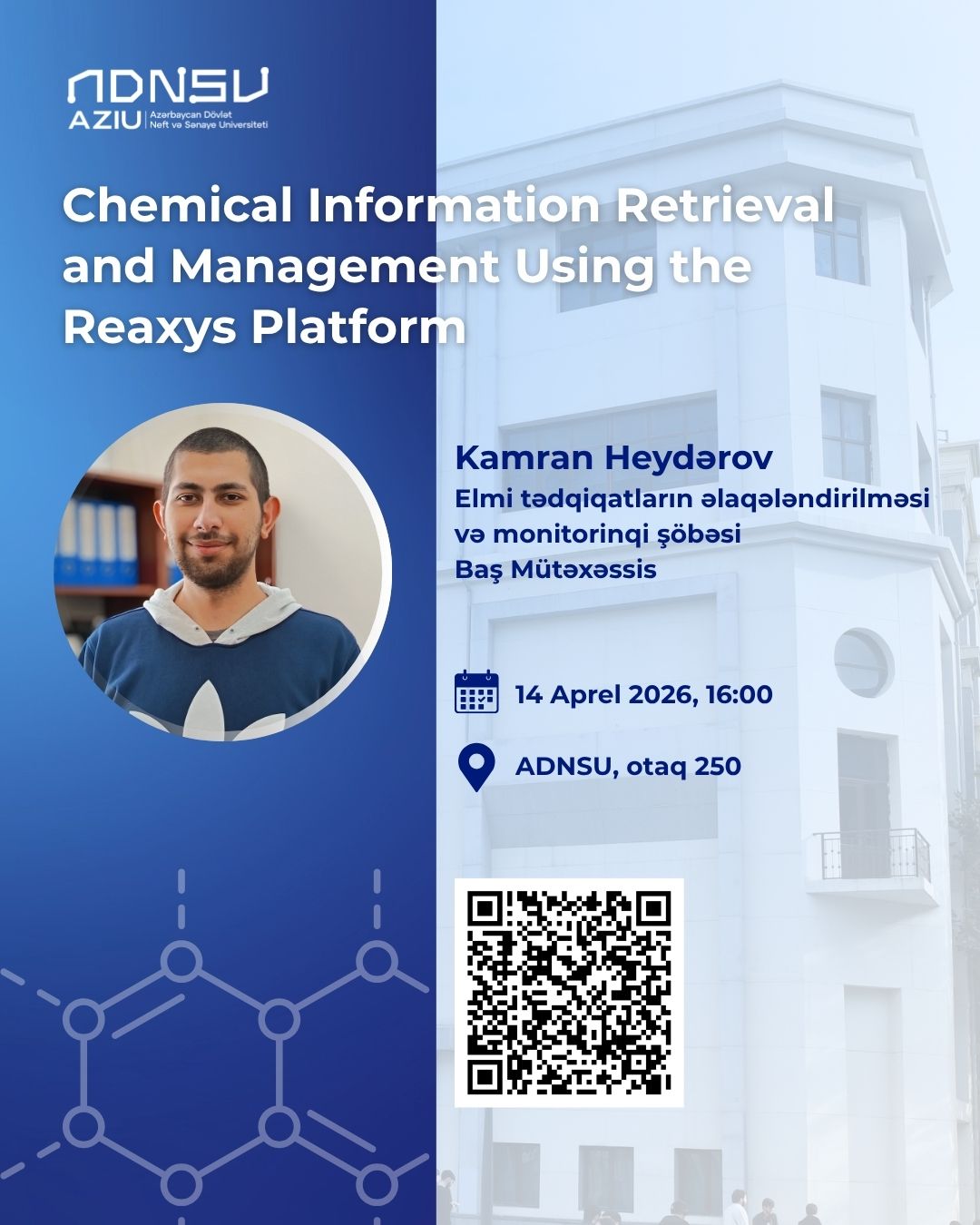 14 aprel 2026-cı il tarixində saat 16:00-da 250-ci otaqda elmi tədqiqatlar üçün geniş istifadə olunan Reaxys platformasını istifadəsinə həsr olunmuş seminar təşkil olunacaq. Seminar zamanı iştirakçılara platformanın əsas imkanları, kimyəvi birləşmələrin və reaksiyaların axtarışı, elmi məqalələr və məlumat bazası ilə daha səmərəli işləmə üsulları barədə məlumat veriləcək.
