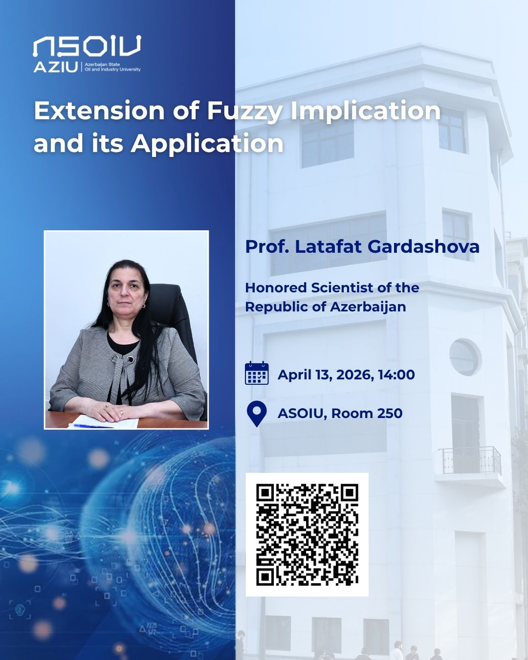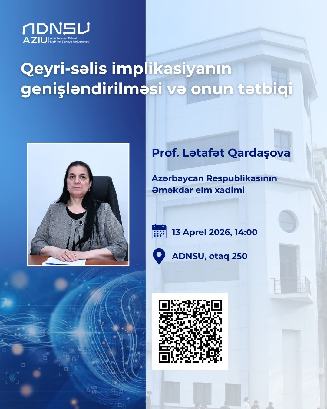 Azərbaycan Dövlət Neft və Sənaye Universitetində (ADNSU) “Qeyri-səlis implikasiyanın genişləndirilməsi və onun tətbiqi” mövzusunda elmi seminar keçiriləcək. Seminar universitetin Kompüter mühəndisliyi kafedrasının professoru, texnika elmləri doktoru Lətafət Qardaşova tərəfindən təqdim olunacaq.