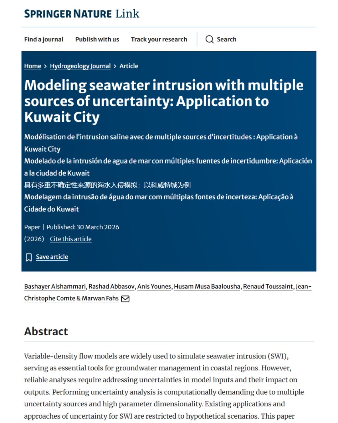 “Çoxsaylı qeyri-müəyyənlik mənbələri nəzərə alınmaqla dəniz suyunun intruziyasının modelləşdirilməsi: Küveyt şəhəri nümunəsində” adlı tədqiqat işində dəniz suyunun sahilboyu yeraltı sulara sızmasını proqnozlaşdıran modellərdə müxtəlif ehtimal olunan xəta payları təhlil edilir. Müəlliflər bu prosesə təsir edən ən kritik faktorları üzə çıxaran və qabaqcıl analiz üsulları sayəsində daha sürətli nəticə verən praktik bir metod təklif edirlər.