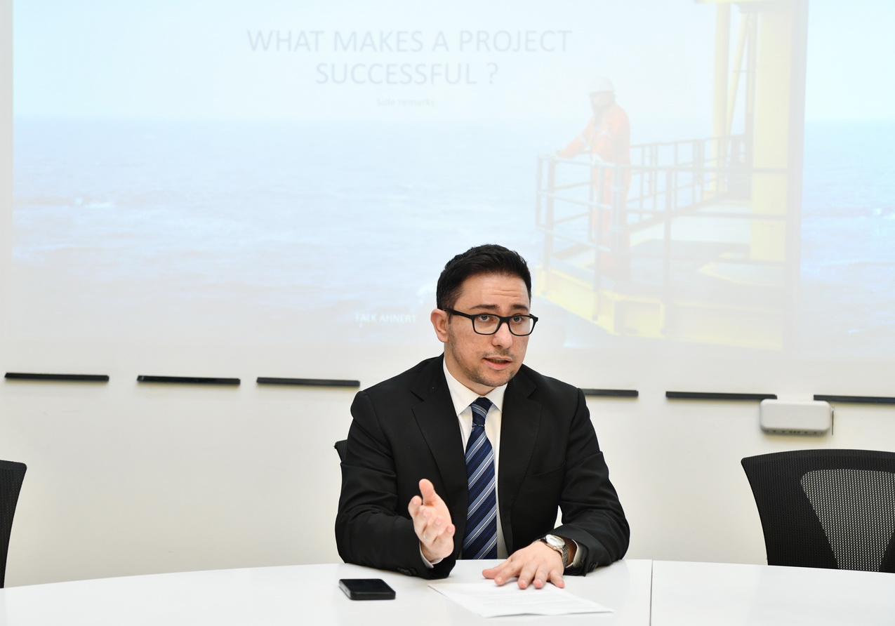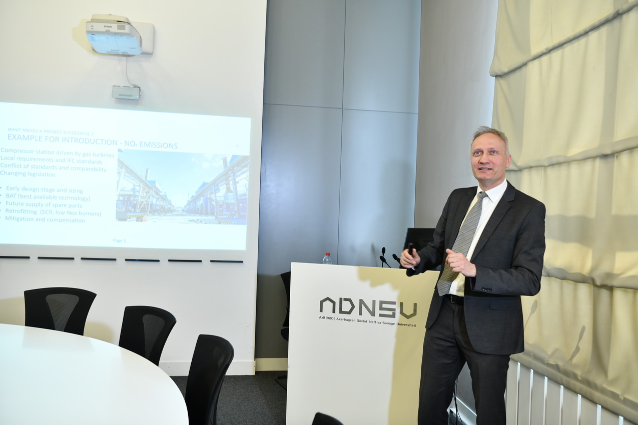 Mühazirə “Wintershall Dea GmbH” şirkətinin kommersiya üzrə məsləhətçisi Dr. Falk Ahnert tərəfindən təqdim olunub. O, sənayedə uzun illərə söykənən zəngin təcrübəsini iştirakçılarla bölüşüb. Sessiya çərçivəsində risklərin idarə olunması məsələlərinə xüsusi diqqət yetirilib. Risklərin müəyyən edilməsi, monitorinqi, idarəetmə strukturları və icra mexanizmləri real sənaye nümunələri əsasında izah olunub.