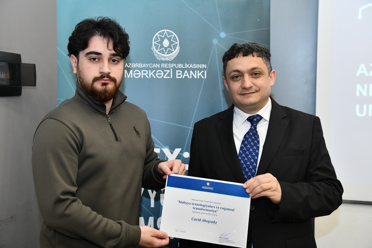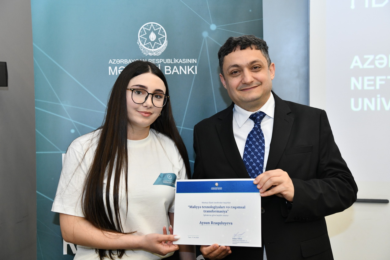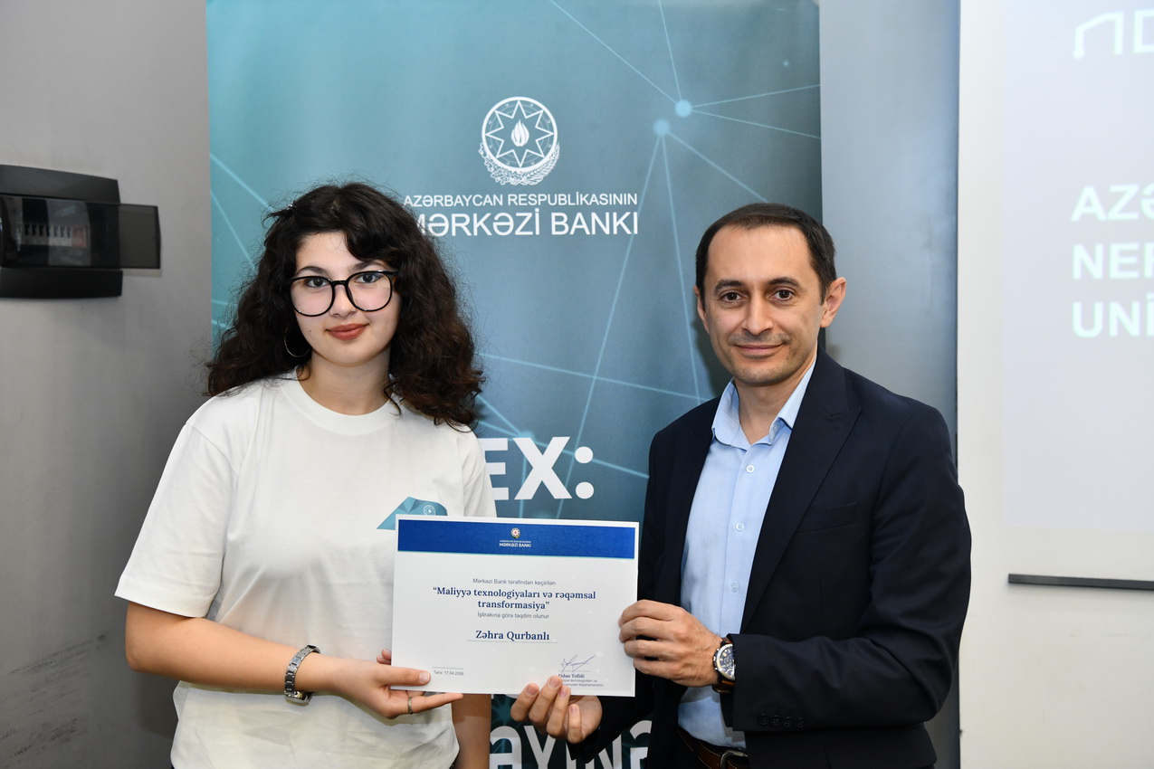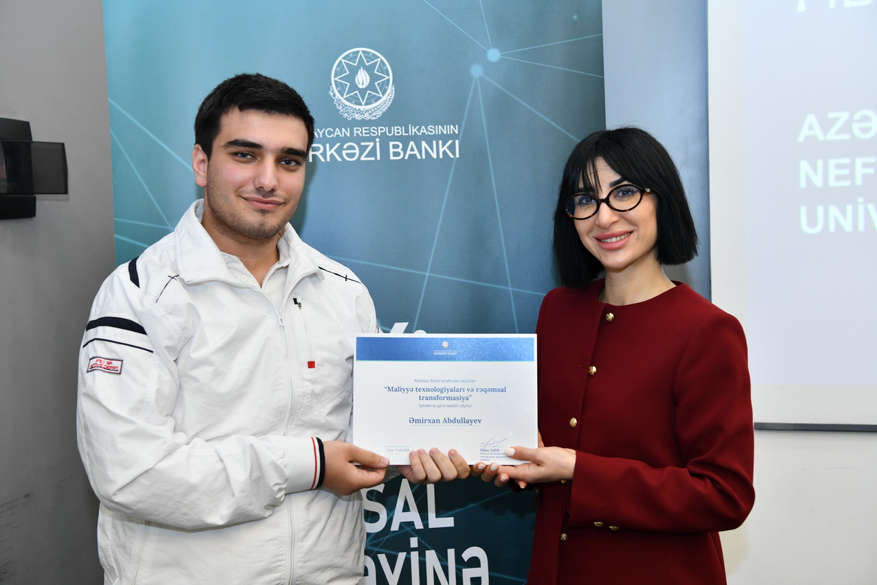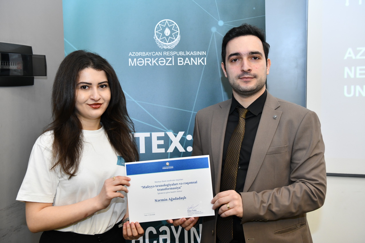 Təlimin son günündə keçirilən sertifikatların təqdimetmə mərasimində ADNSU-nun elmi və innovasiya məsələləri üzrə prorektoru Elviz İsmayılov, Məzunlarla iş və Karyera Mərkəzinin müdiri Şamil Əhmədov, rektorun sosial məsələlər üzrə müşaviri Nəsibə Əmirbəyova, həmçinin Mərkəzi Bankın Maliyyə texnologiyaları və innovasiyalar departamentinin direktoru Fidan Tofidi və Xüsusi tənzimləmə rejiminin təşkili şöbəsinin müdiri Sahib Həsənov iştirak ediblər.