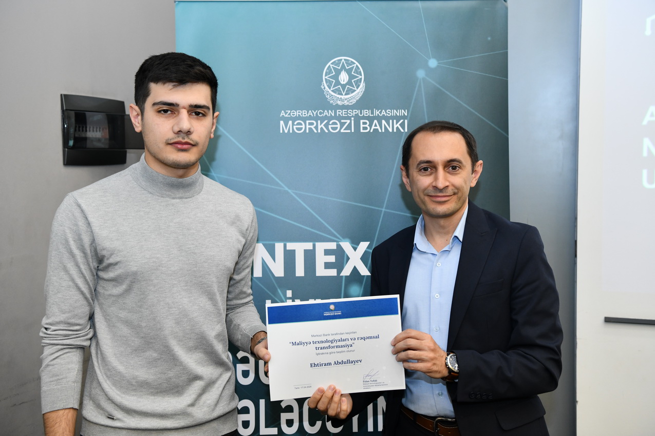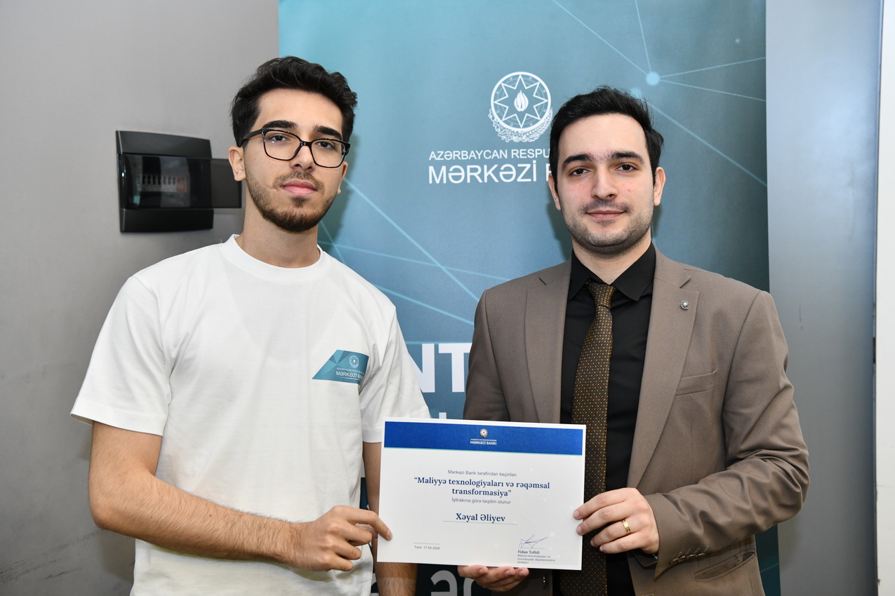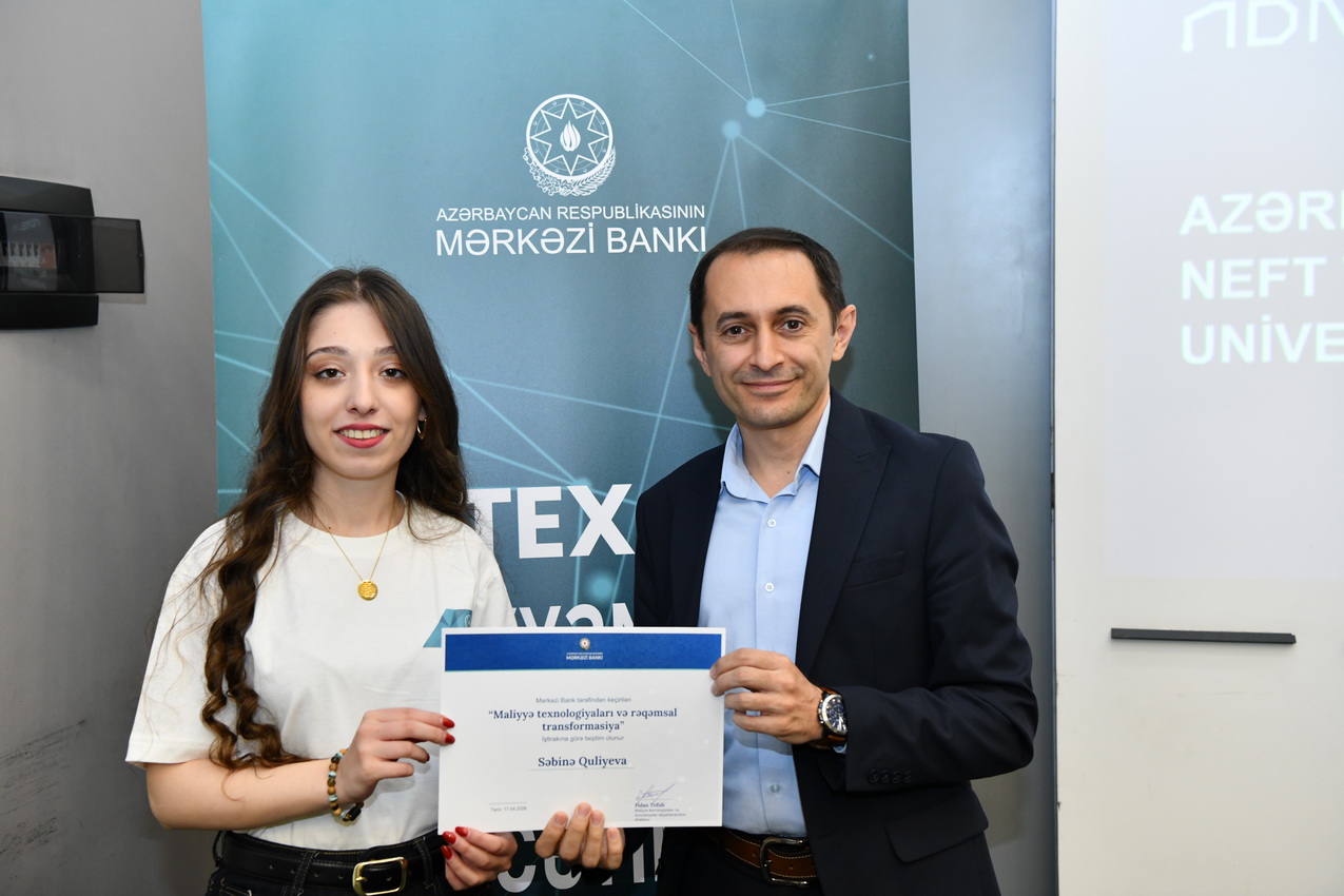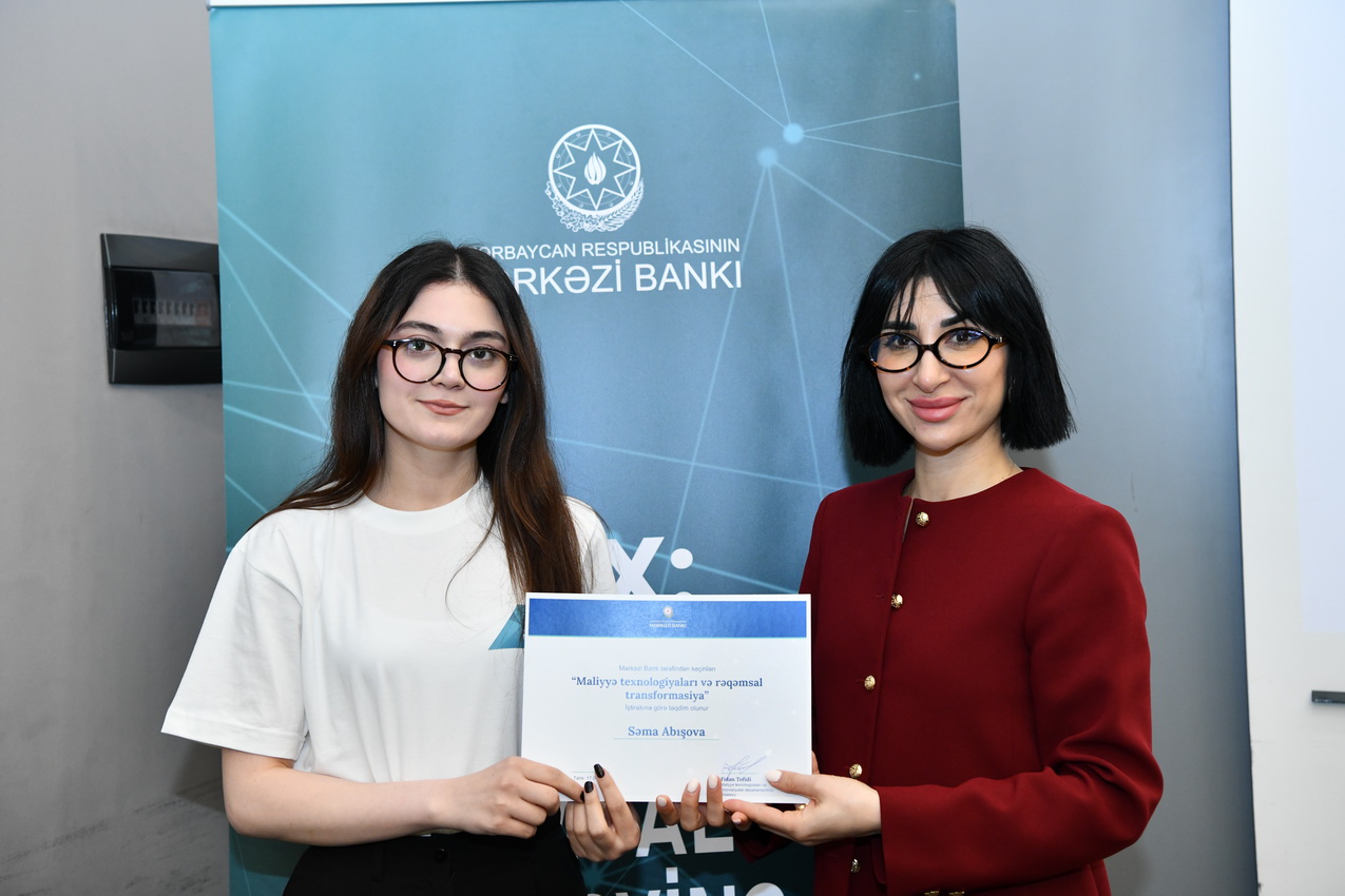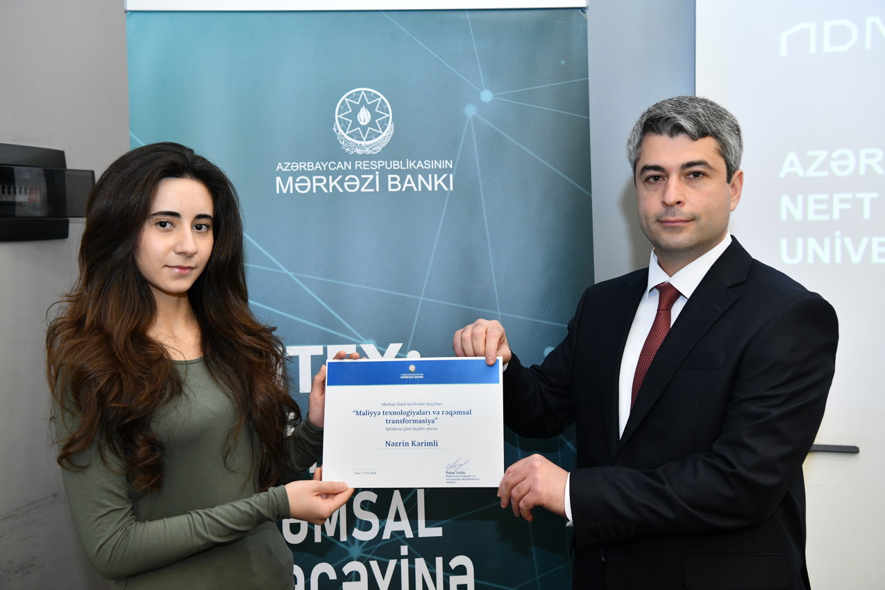 Təlimin son günündə keçirilən sertifikatların təqdimetmə mərasimində ADNSU-nun elmi və innovasiya məsələləri üzrə prorektoru Elviz İsmayılov, Məzunlarla iş və Karyera Mərkəzinin müdiri Şamil Əhmədov, rektorun sosial məsələlər üzrə müşaviri Nəsibə Əmirbəyova, həmçinin Mərkəzi Bankın Maliyyə texnologiyaları və innovasiyalar departamentinin direktoru Fidan Tofidi və Xüsusi tənzimləmə rejiminin təşkili şöbəsinin müdiri Sahib Həsənov iştirak ediblər.
