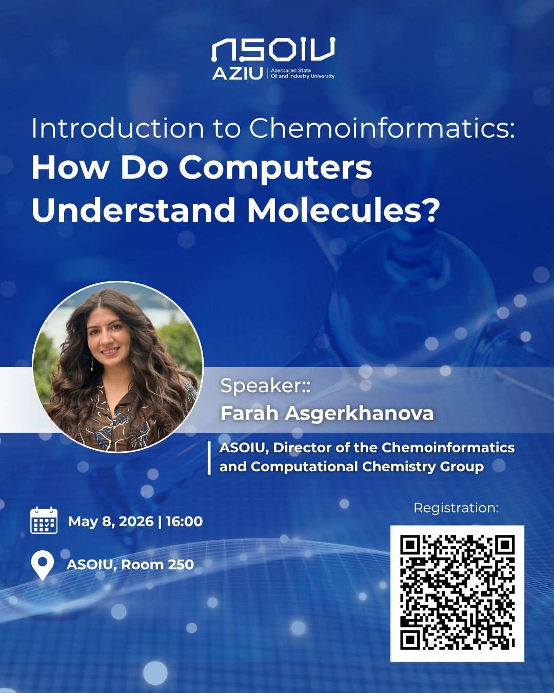 Seminarın məruzəçisi ADNSU-nun Kemoinformatika və Hesablama Kimyası qrupunun direktoru, kemoinformatika üzrə tədqiqatçı Fərəh Əsgərxanovadır. O, kimya mühəndisliyi üzrə bakalavr təhsilini UFAZ-da almış, magistratura təhsilini UFAZ və Strasburq Universitetində davam etdirmiş, daha sonra isə Strasburq Universitetində kemoinformatika üzrə fəlsəfə doktoru dərəcəsinə yiyələnmişdir. Onun elmi fəaliyyət istiqamətlərinə QSPR/QSAR modelləşdirilməsi, kimyəvi fəza analizi və molekulyar deskriptorlar daxildir.