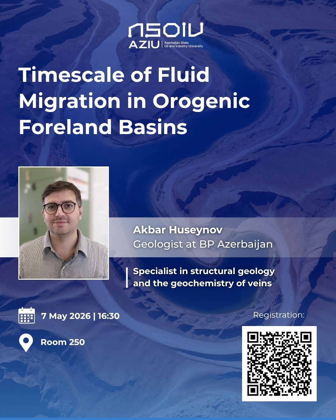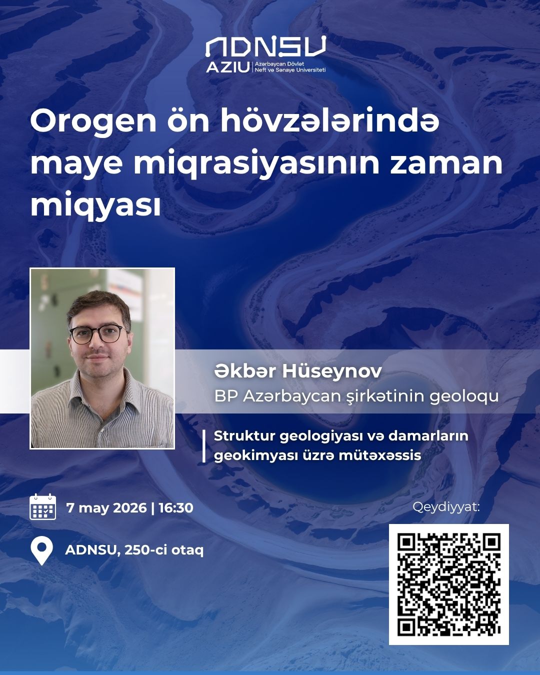 Azərbaycan Dövlət Neft və Sənaye Universitetində (ADNSU) 7 may 2026-cı il tarixində saat 16:30-da 250-ci otaqda “Orogen ön hövzələrində maye miqrasiyasının zaman miqyası” mövzusunda seminar təşkil olunacaq.