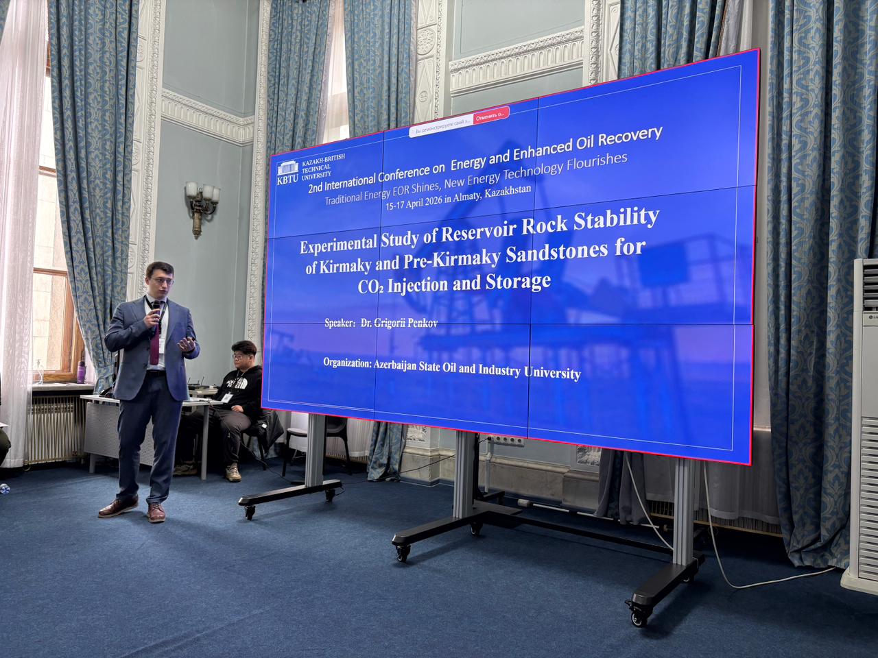 Konfrans çərçivəsində Dr. Q.Penkov komanda işi kimi “Kirmaky və Pre-Kirmaky qumdaşlarının CO₂ inyeksiyası və saxlanması üçün rezervuar süxur sabitliyinin eksperimental tədqiqi” mövzusunda elmi tədqiqat işini təqdim edərək əsas məruzəçi qismində çıxış edib. Tədqiqatda yeraltı süxurların karbon qazının təhlükəsiz şəkildə saxlanması üçün dayanıqlılığı araşdırılıb.